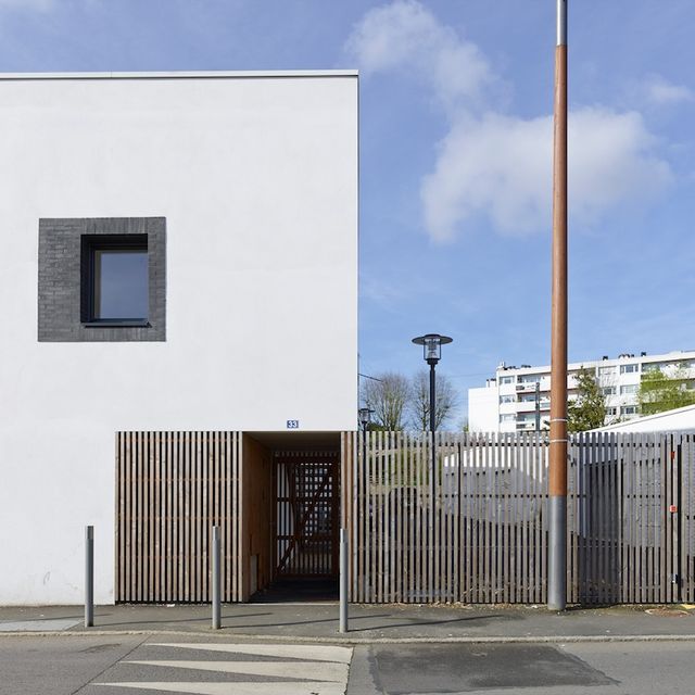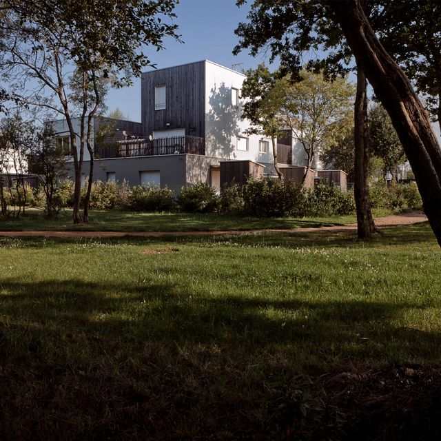 Le présent projet est situé dans la Zac de la Pelousière sur la Commune de Saint Herblain. Il se compose en trois îlots de 6 à 8 maisons chacun. La combinatoire qui organise la répartition des typologies permet de mixer des principes de distribution différents selon les types de logement. Elle génère une séquence urbaine par groupe de maison. De légères variations soit dans le matériau, soit dans le traitement des volumes, singularisent chacune des maisons. Leur décalage permet de se jouer des différents alignements des façades et surtout s’appuient sur des décrochés et débords de toit pour calmer la composition et accompagner la déclivité du terrain. Ces trois principes de volume déclinent un travail sur l’épaisseur de la masse bâtie en introduisant un rapport tangible avec la construction. Le matériau bois en contrepoids est décliné en trois essences différentes. Elle génère une séquence urbaine par groupe de 3 Maisons maximum.