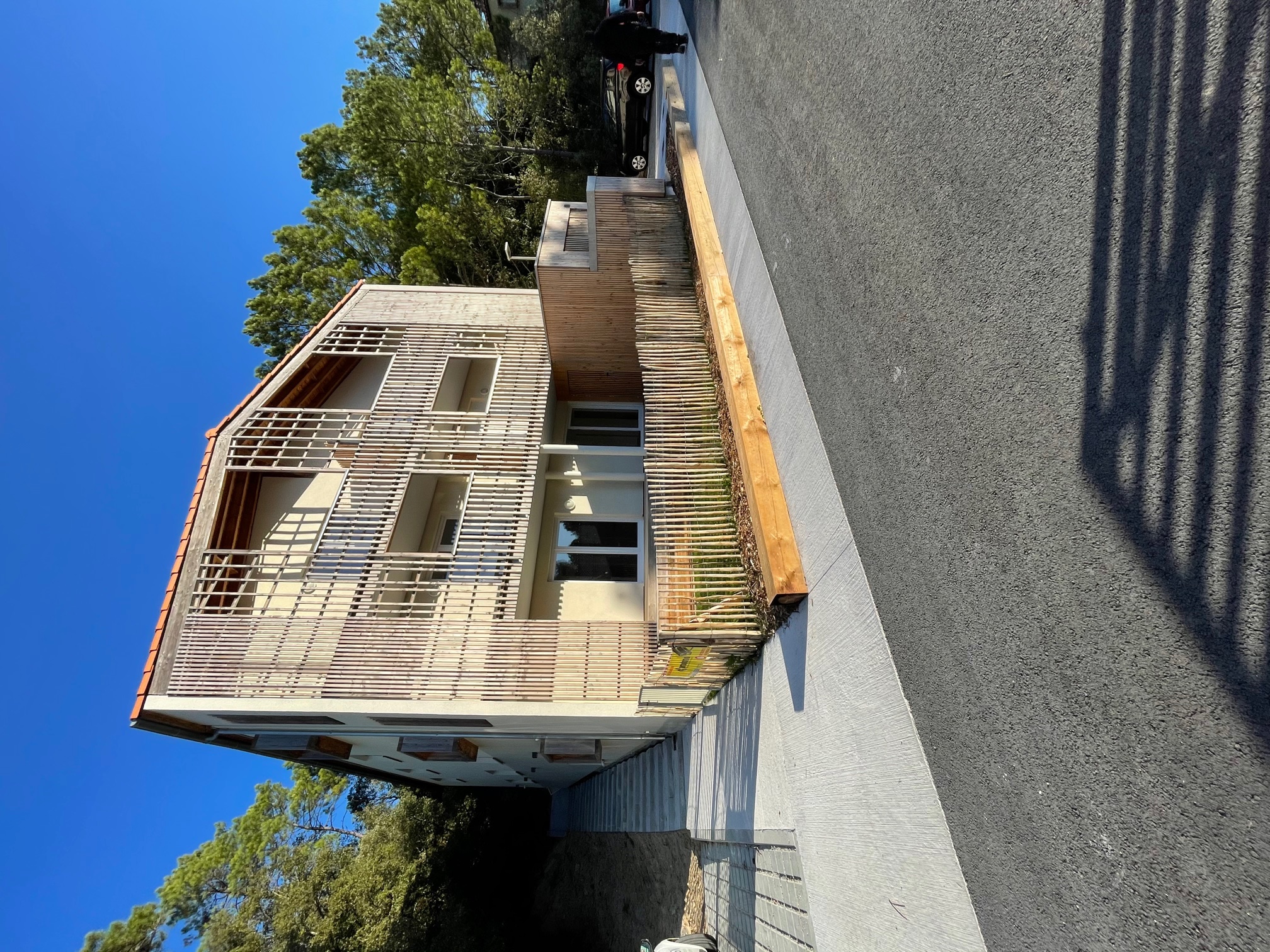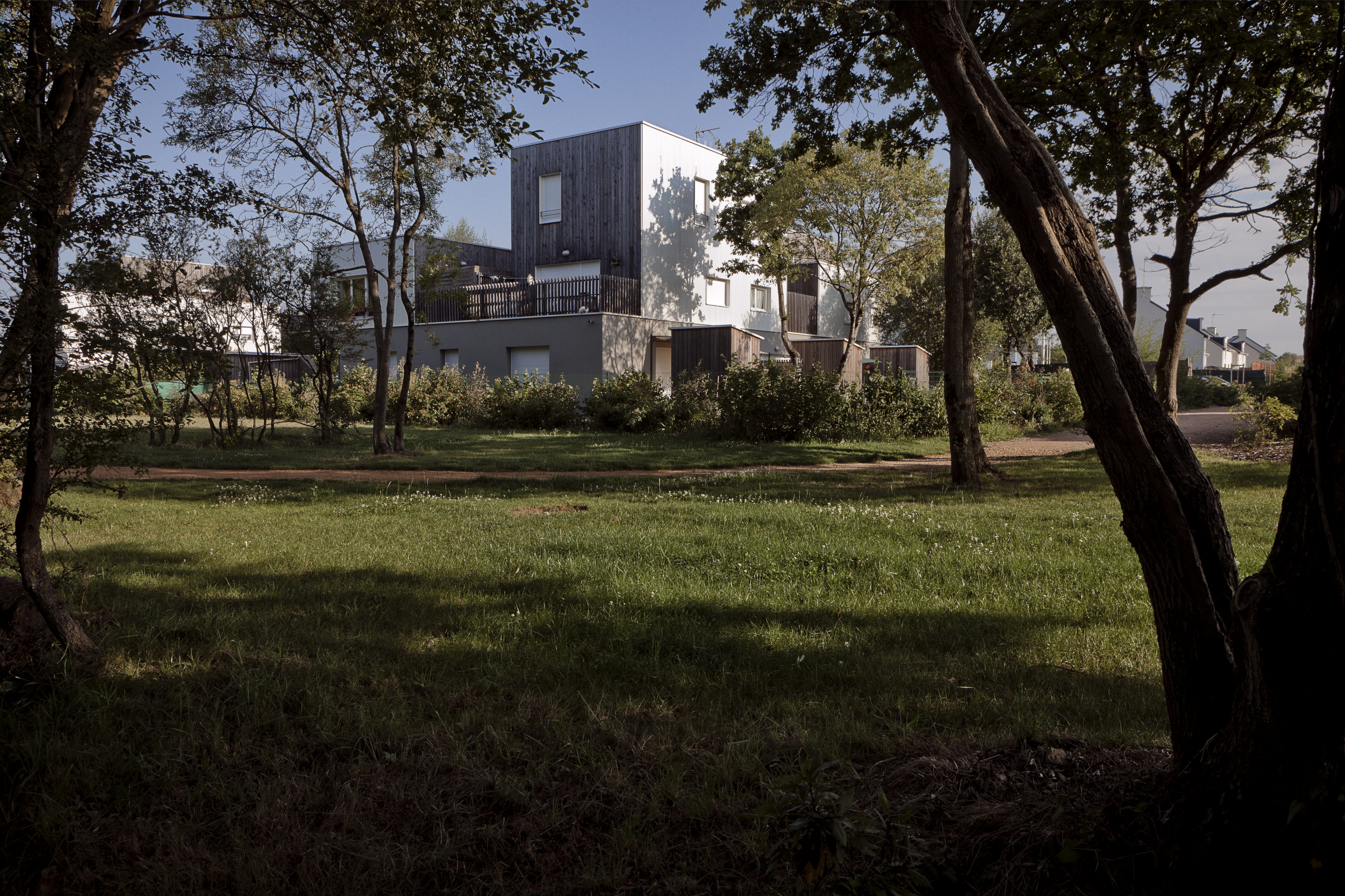 Le projet occupe la partie Nord-Ouest du site et articule l’entrée principale de ce nouveau quartier en formant un micro territoire. Il bénéficie d’une position dominante sur ce parc habité. Le programme est réparti en quatre sous-ensembles de 3 & 2 maisons groupées. Les orientations urbaines privilégient des implantations concourant à définir des cheminements, qu’ils soient piétons ou automobiles, qui se glissent entre les constructions et privilégient les vues et orientations favorables. Une combinatoire permet de semer de manière homogène les typologies entre les quatre groupes bâtis. Chacun des groupes de maisons va répondre de manière adaptée à la topographie du terrain et leur organisation intérieure découle de leur orientation. Deux principes sont définis : Les maisons Nord/Sud et les Maisons Est/Ouest. Les habitations sont rythmées par des redans et des refends qui rythment les constructions et singularisent les maisons. Elles affichent une belle minéralité et massivité façade Nord. Côté Sud elles ont un caractère plus ouvert. Un bardage bois dont les lames sont de largeur variable vibre sous le soleil.