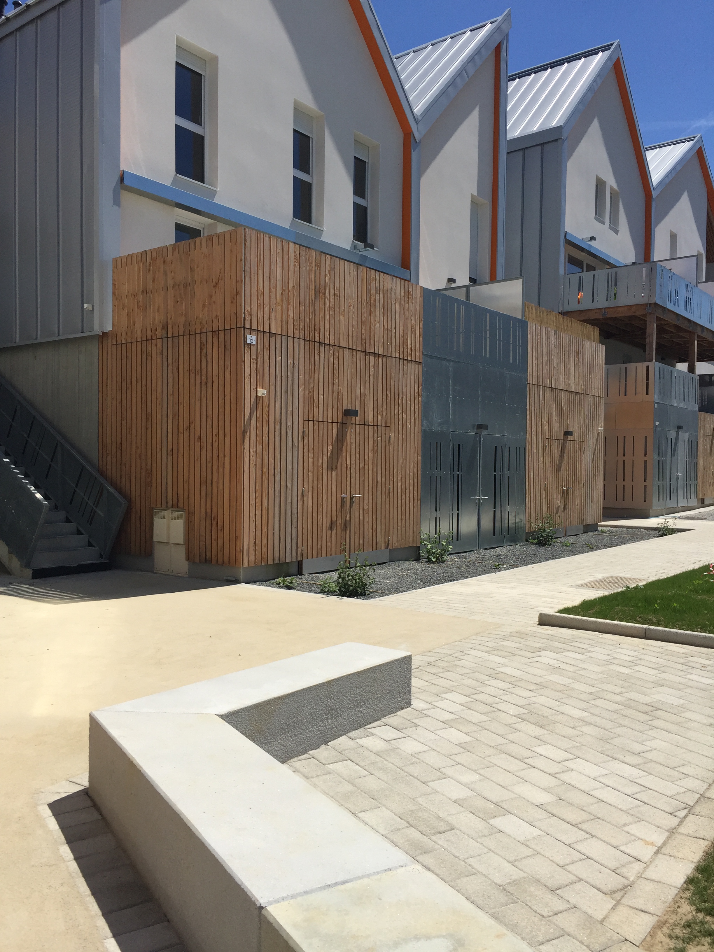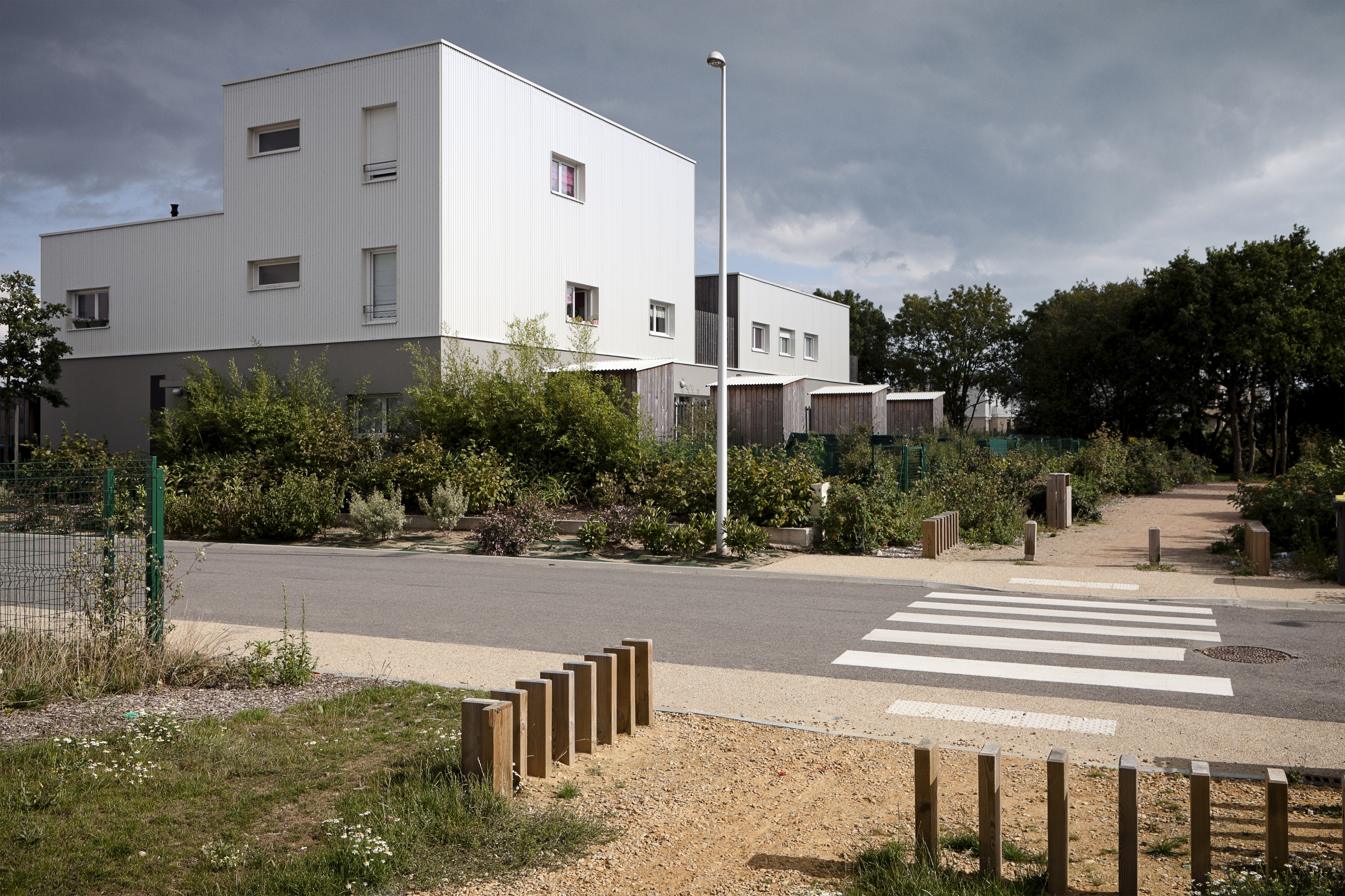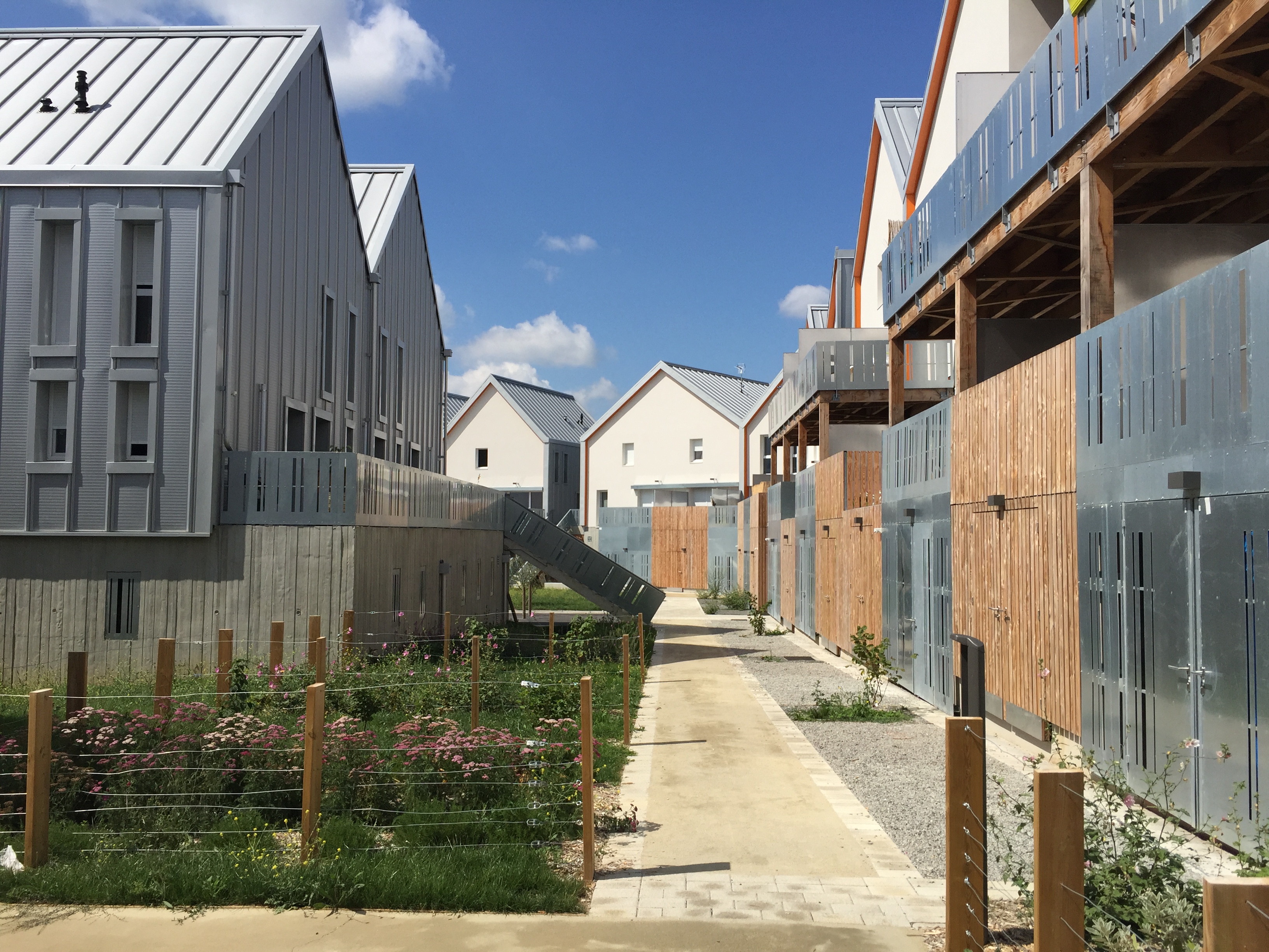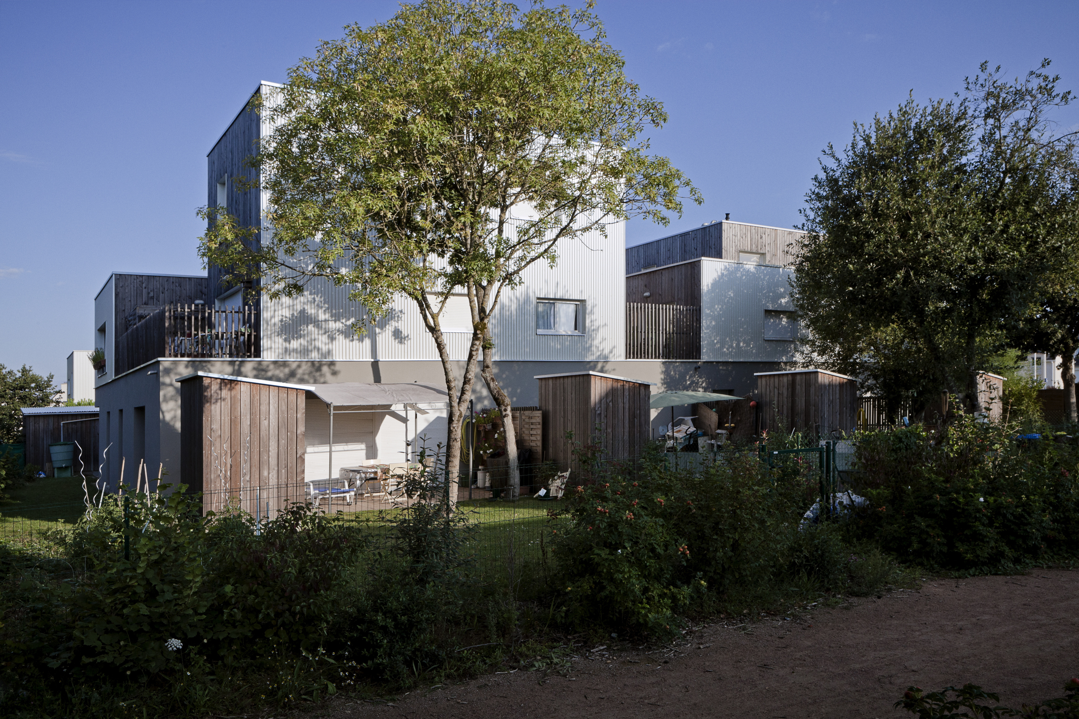 Tous les logements sont traversants Nord/Sud ou Est/Ouest. Les maisons individuelles sont adressées au Sud. Une clôture épaisse qui abrite un local rangement met à distance le jardin Sud par rapport à la rue. Les logements collectifs sont desservis par une coursive Nord accessible depuis le chemin piéton. Ce basculement permet d’animer l’ensemble des façades mais aussi de libérer celles avec l’ensoleillement favorable. Le toit constitue un élément unificateur du projet mais aussi le moyen d’identifier les différentes combinatoires et éléments du programme.