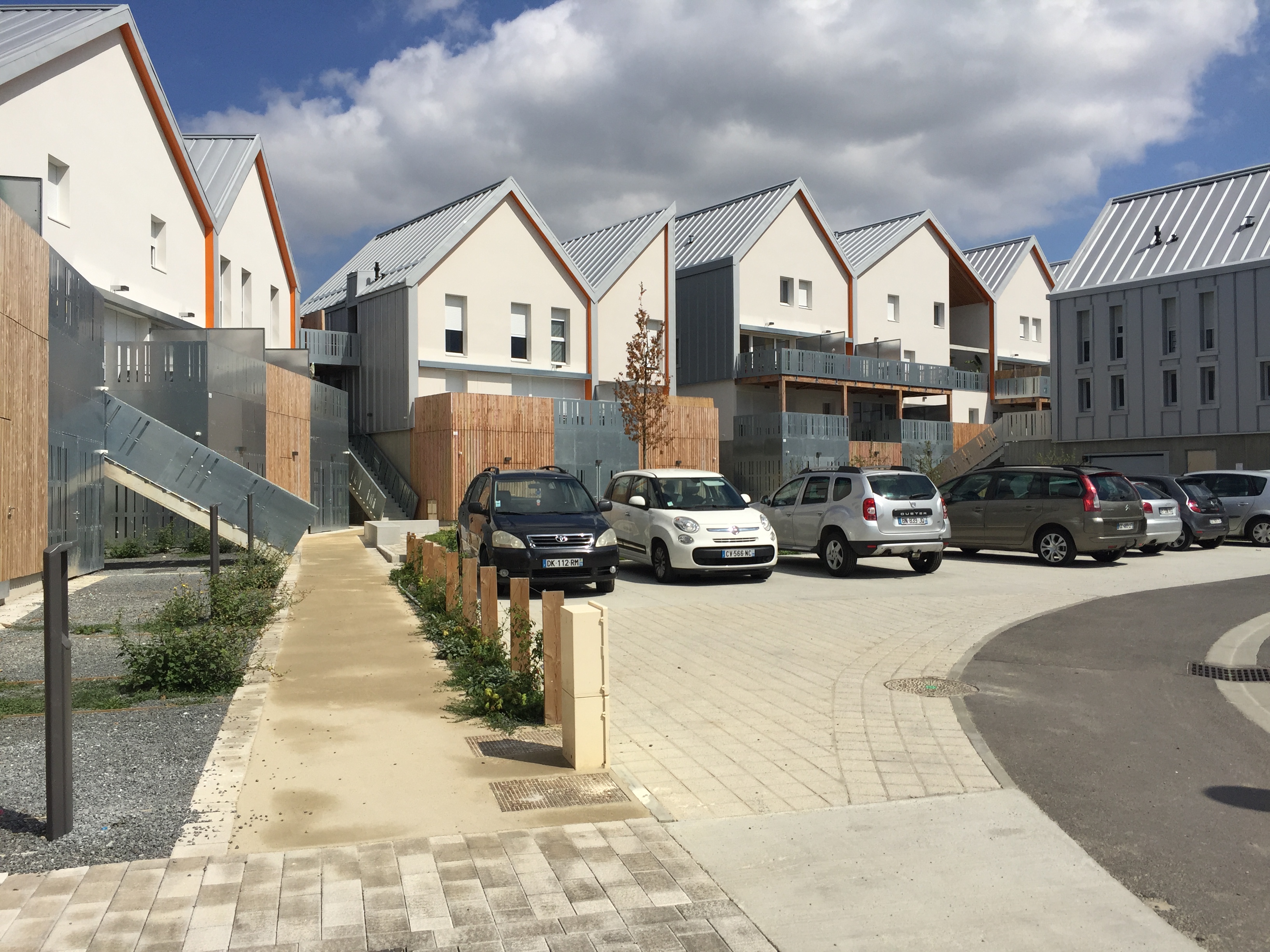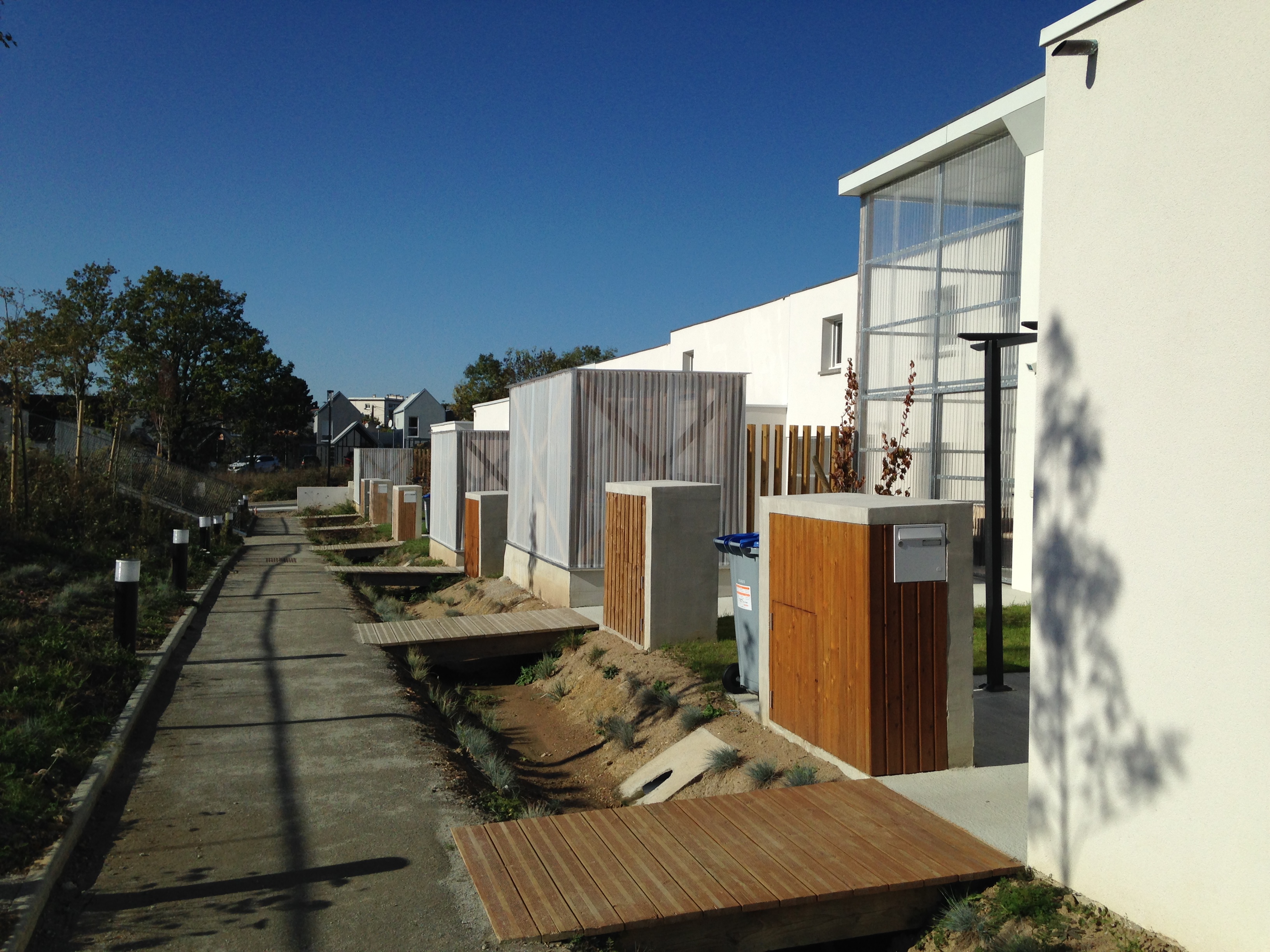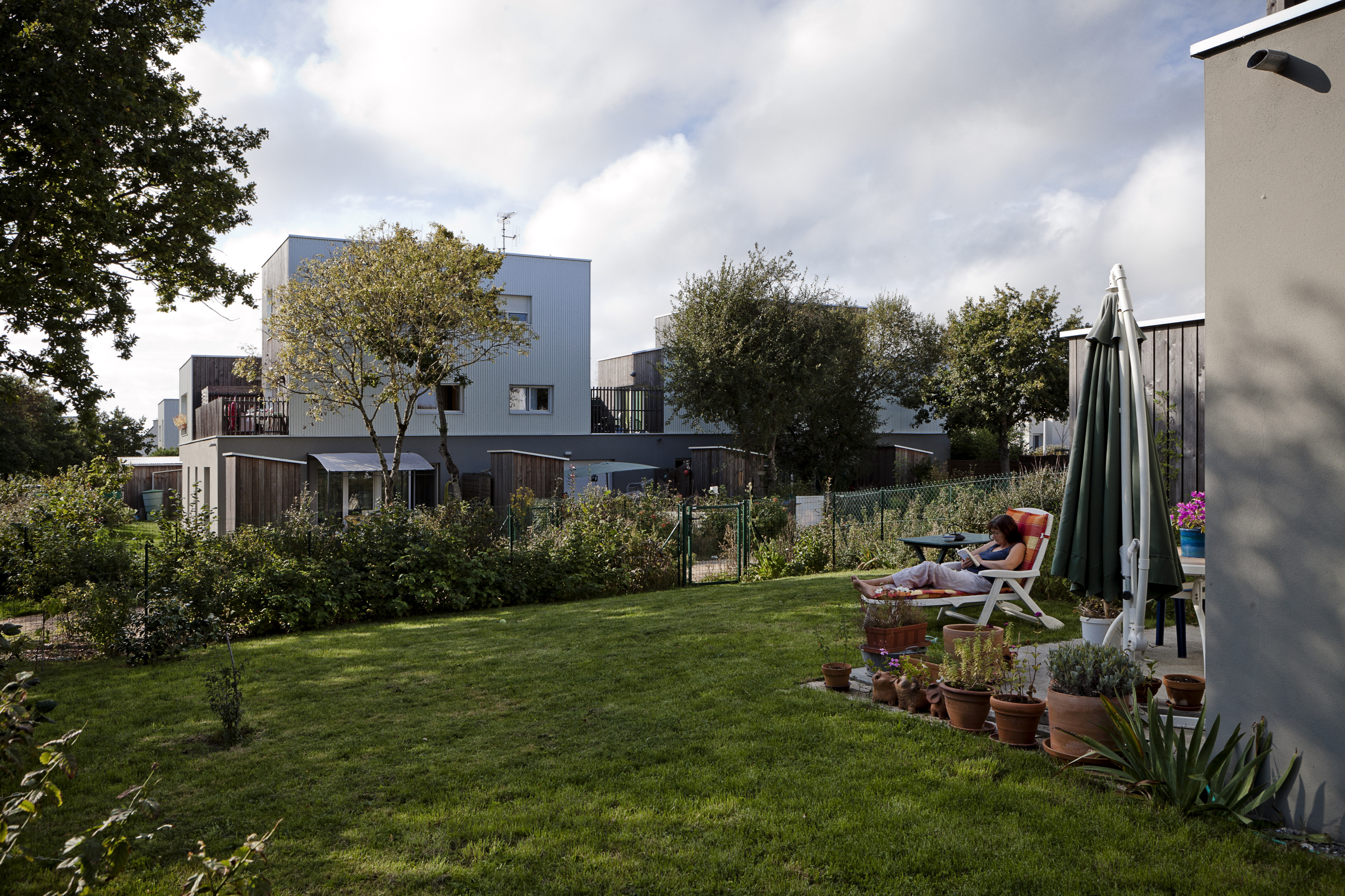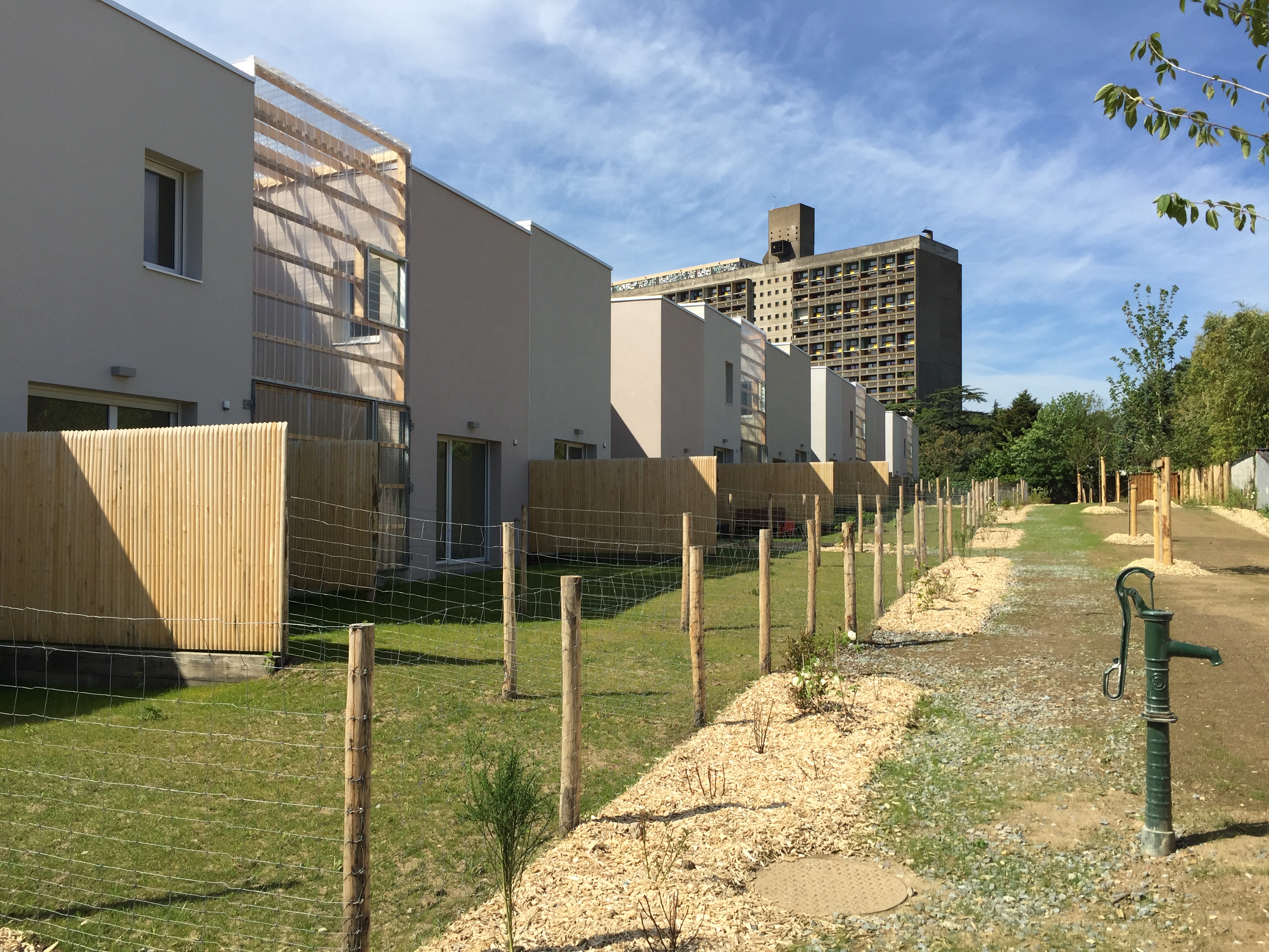 Tous les logements sont traversants Nord/Sud ou Est/Ouest. Les maisons individuelles sont adressées au Sud. Une clôture épaisse qui abrite un local rangement met à distance le jardin Sud par rapport à la rue. Les logements collectifs sont desservis par une coursive Nord accessible depuis le chemin piéton. Ce basculement permet d’animer l’ensemble des façades mais aussi de libérer celles avec l’ensoleillement favorable. Le toit constitue un élément unificateur du projet mais aussi le moyen d’identifier les différentes combinatoires et éléments du programme.