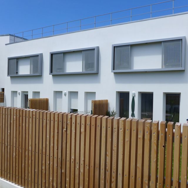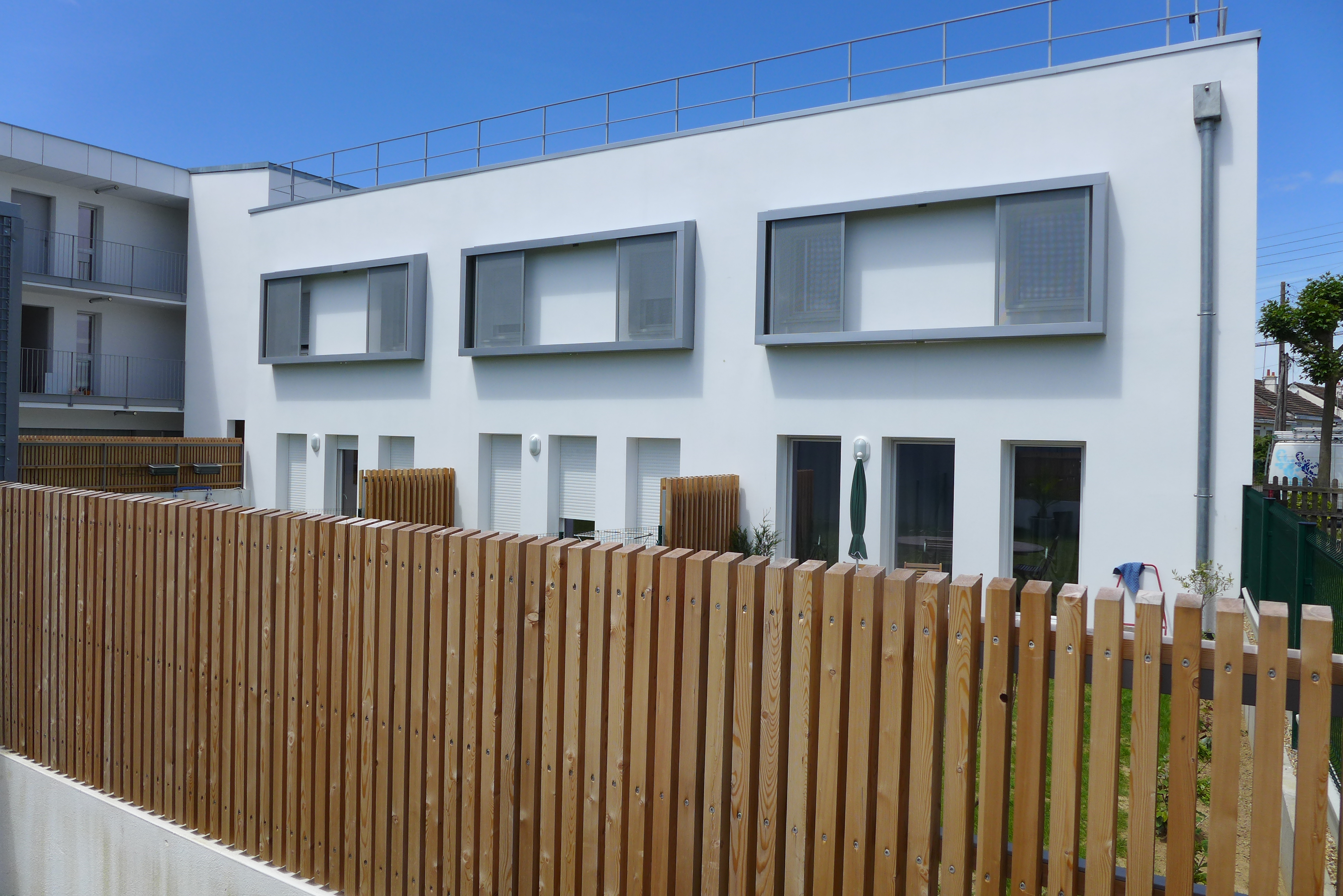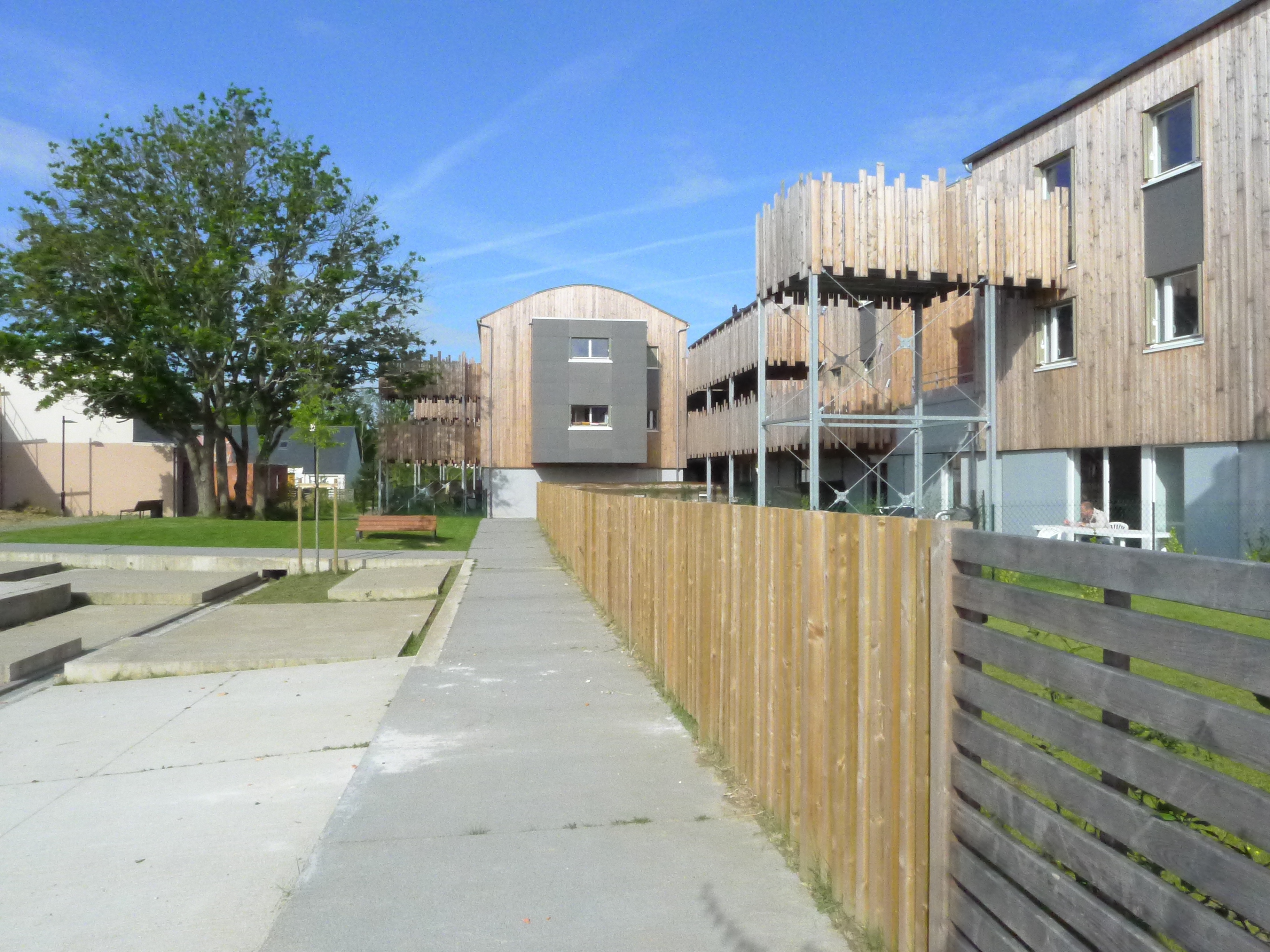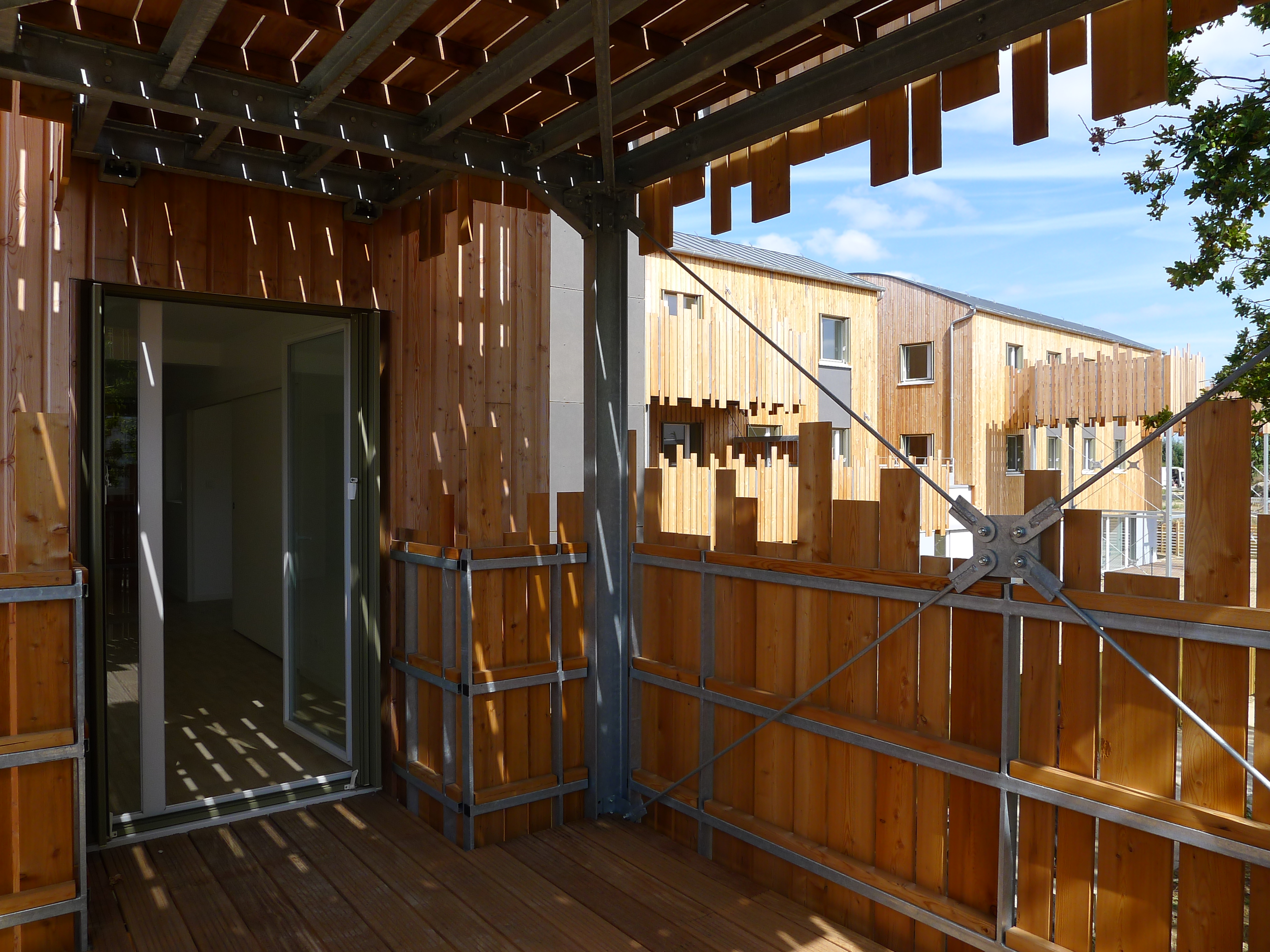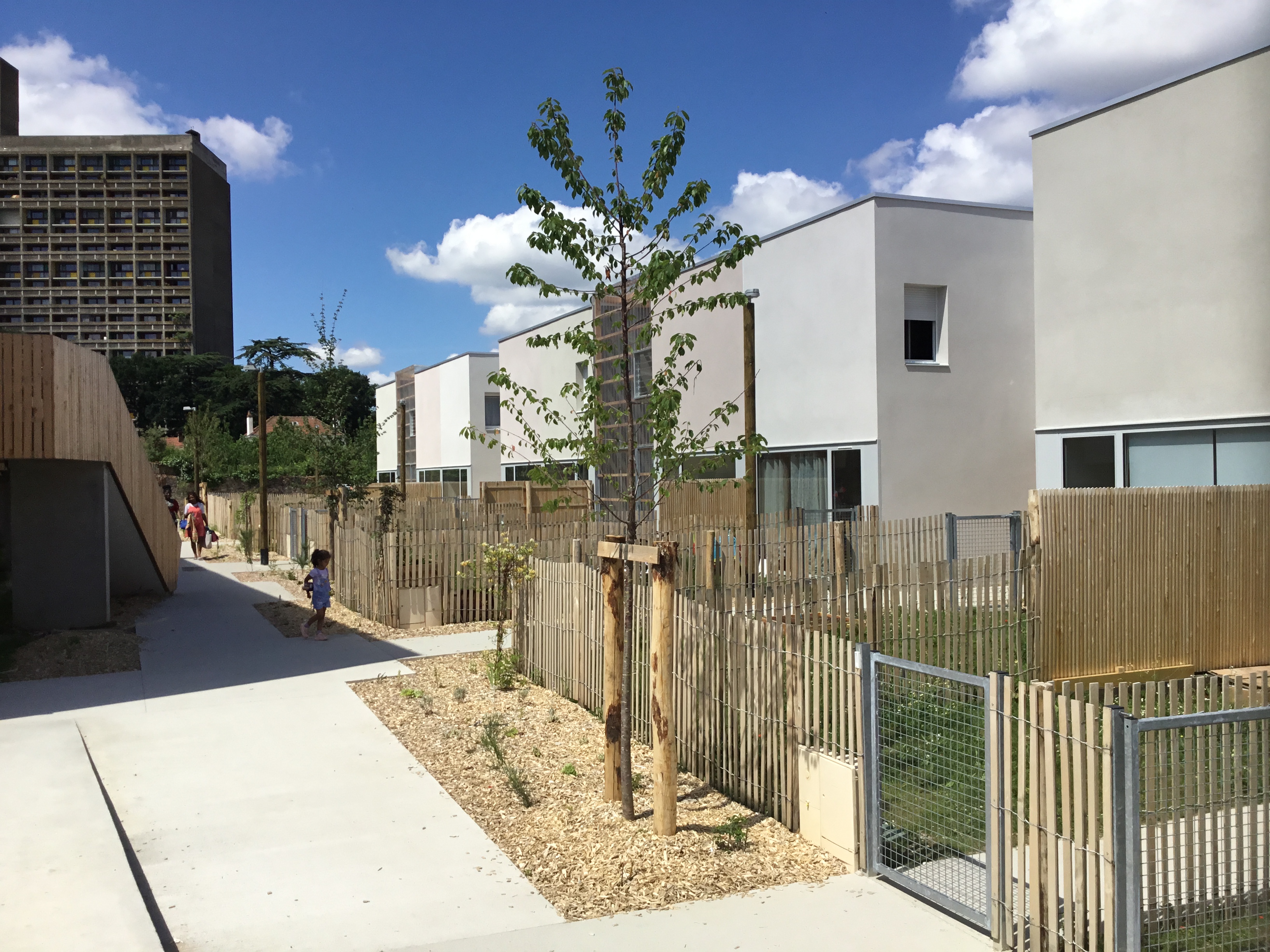 Tous les logements sont traversants Nord/Sud ou Est/Ouest. Les maisons individuelles sont adressées au Sud. Une clôture épaisse qui abrite un local rangement met à distance le jardin Sud par rapport à la rue. Les logements collectifs sont desservis par une coursive Nord accessible depuis le chemin piéton. Ce basculement permet d’animer l’ensemble des façades mais aussi de libérer celles avec l’ensoleillement favorable. Le toit constitue un élément unificateur du projet mais aussi le moyen d’identifier les différentes combinatoires et éléments du programme.