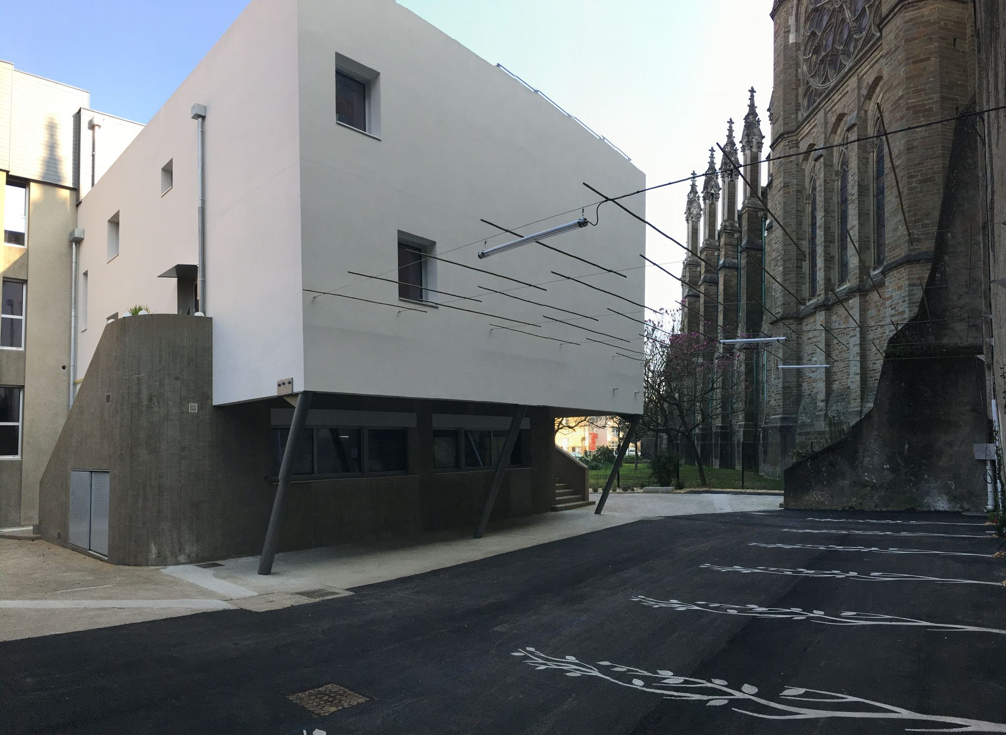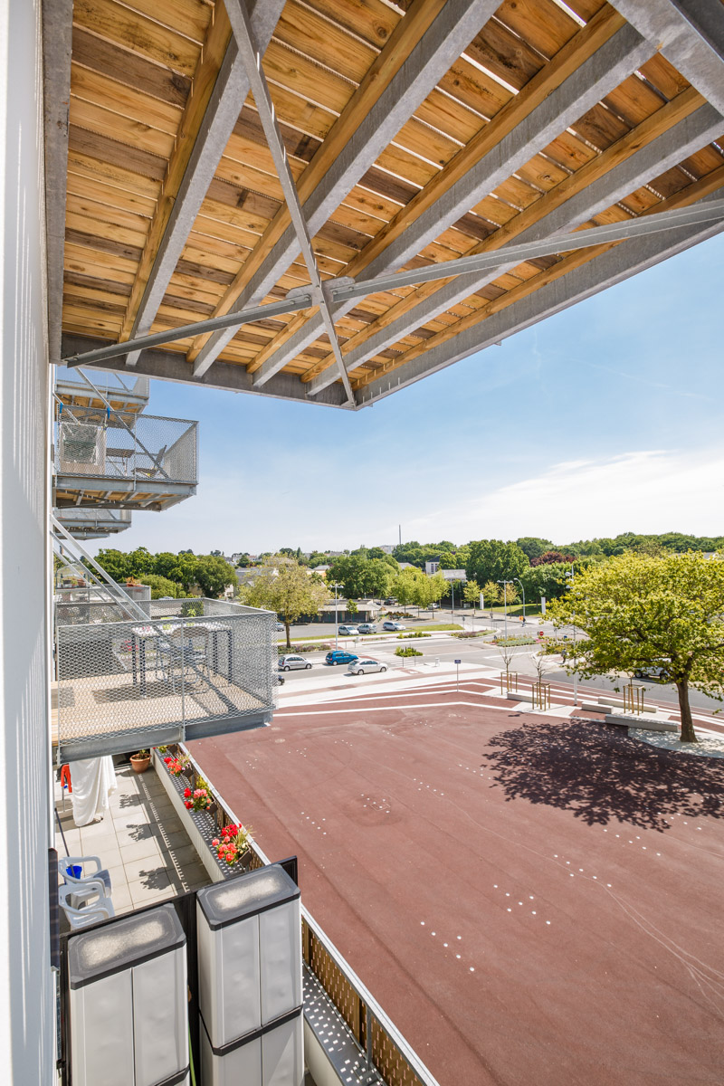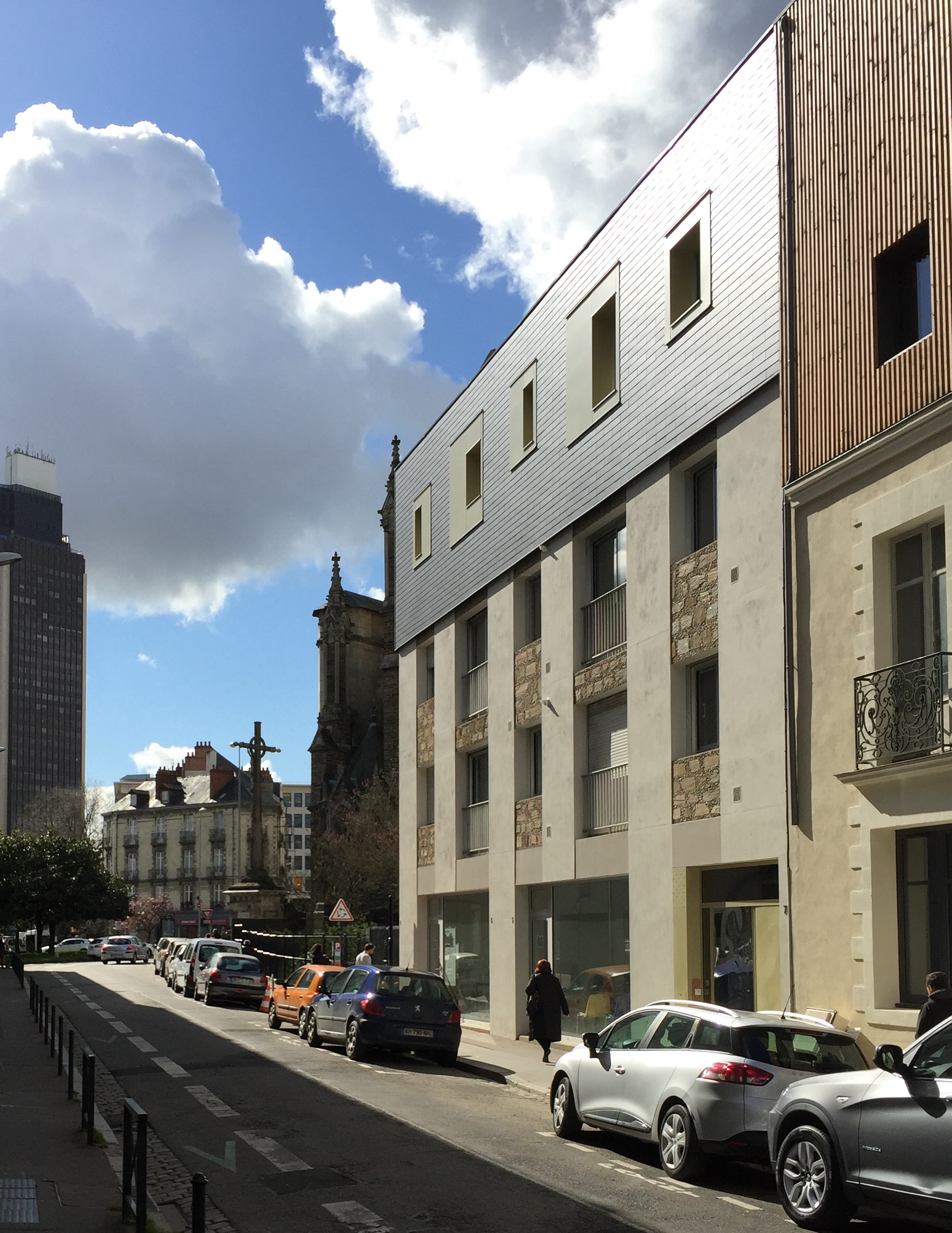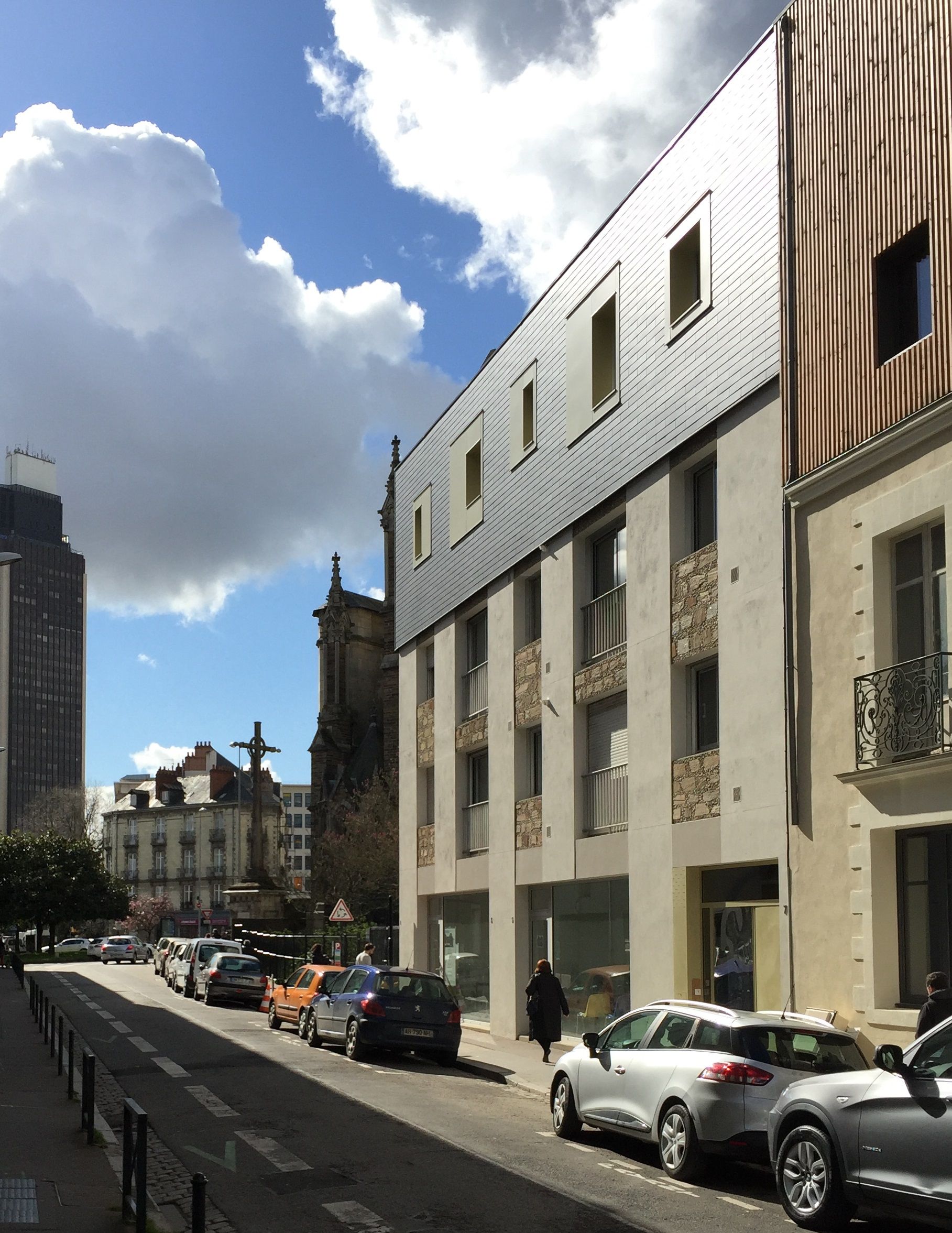 Le terrain est situé au cœur du tissu urbain du quartier de Talensac à Nantes. Sur la rue de Bel Air, un premier corps de bâtiment de 3 niveaux, étroit, regroupe 4 logements de type 2 et 2 commerces. En deuxième rideau mais visible depuis la place Saint Similien, un volume cubique borgne, enchâssé par deux escaliers, comporte deux salles multifonctions. Chacun des volumes a sa propre matérialité. Cet ensemble est représentatif des constructions années 70/80. En s’appuyant sur le contexte immédiat et les volumétries, la surélévation reprend le gabarit du bâtiment existant. Tel un prolongement, elle affirme son étroitesse. La vêture réalisée avec un bardage ardoise contraste avec le béton mat et nettoyé du corps principal. La dimension des ouvertures prend en référence celle du bâtiment existant. Les dimensions des fenêtres sont reprises et s’affichent en continuité des travées en tôle laquée à la couleur beige sur la partie en sur élévation. Les ouvertures se jouent de cette composition et apportent une modernité dans le dessin de la façade dans un esprit 70/80 revisité. Aucun logement n’est identique. En s’appuyant sur la structure du bâti, l’organisation offre une grande diversité.