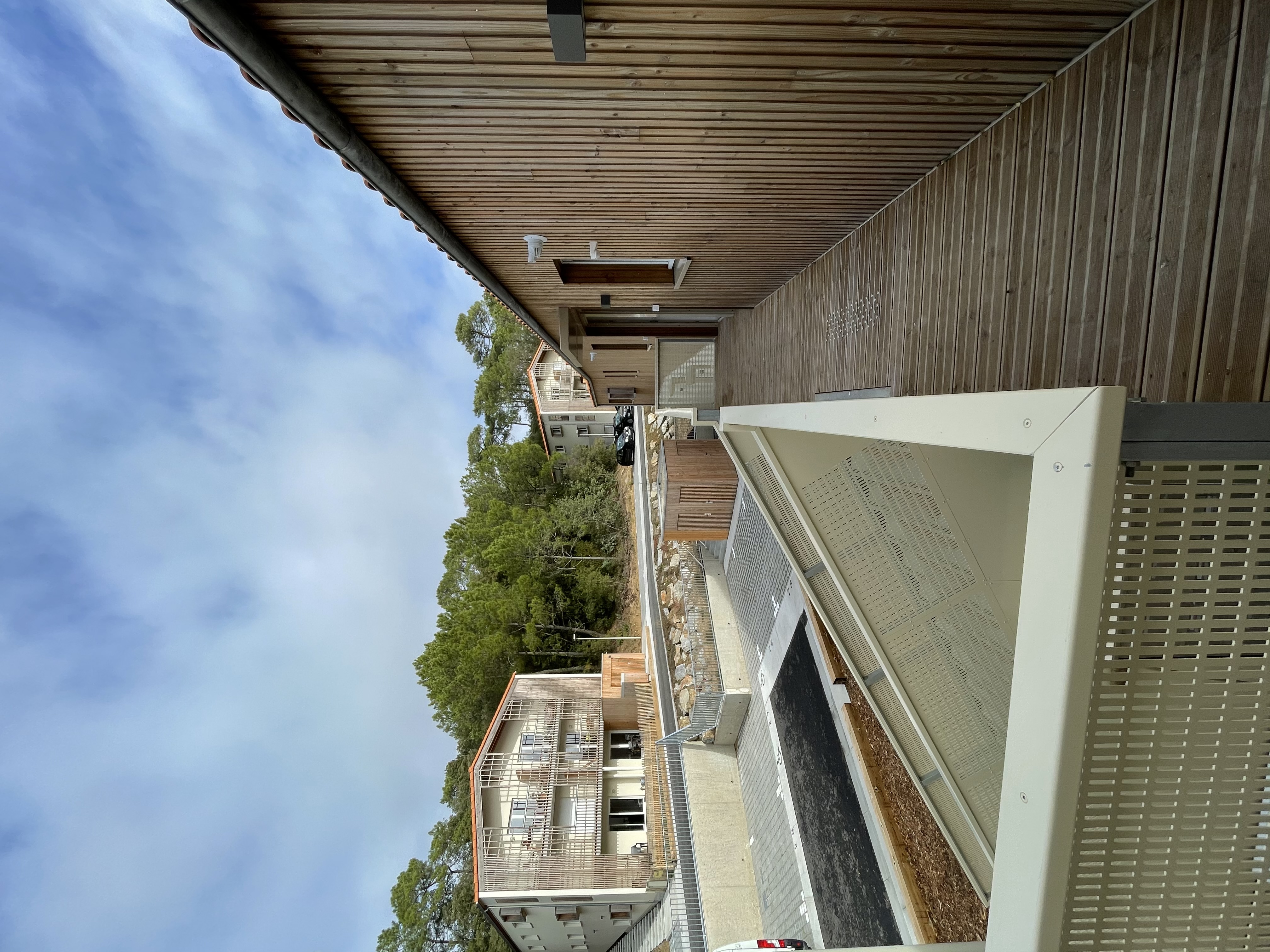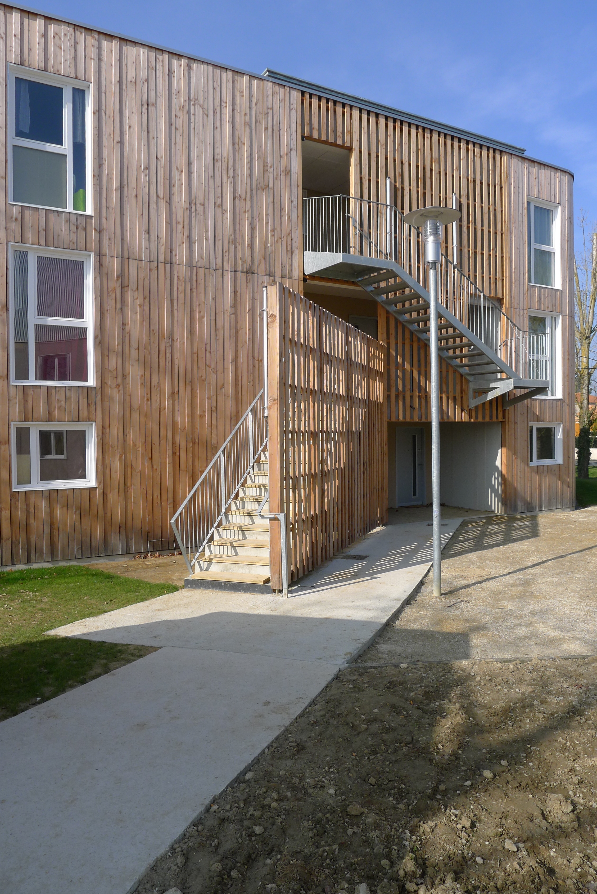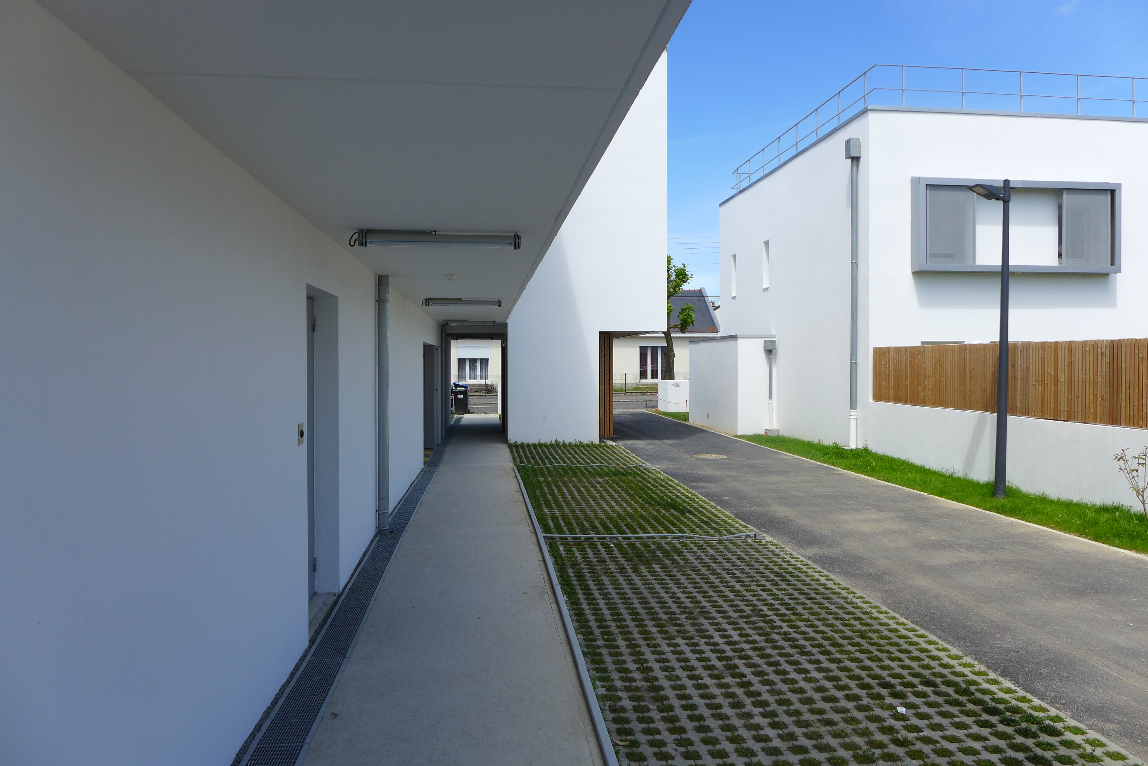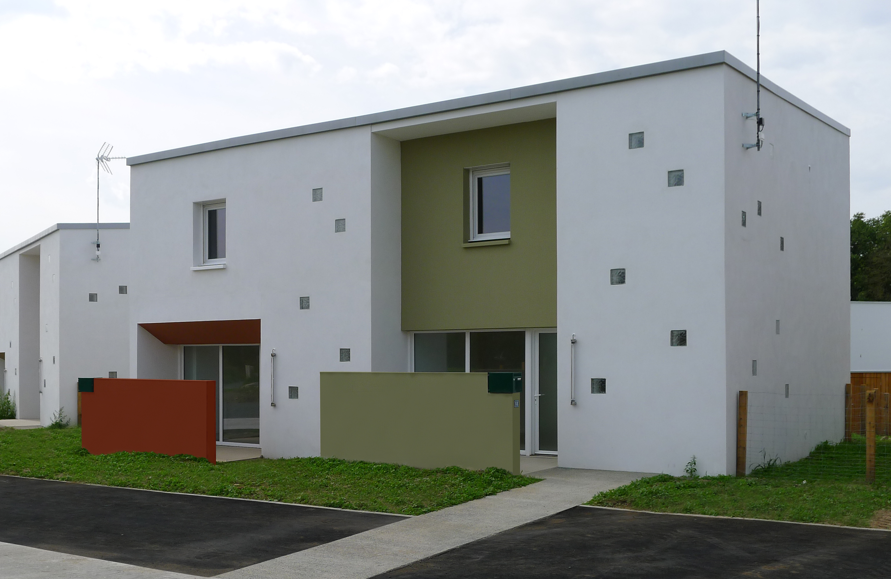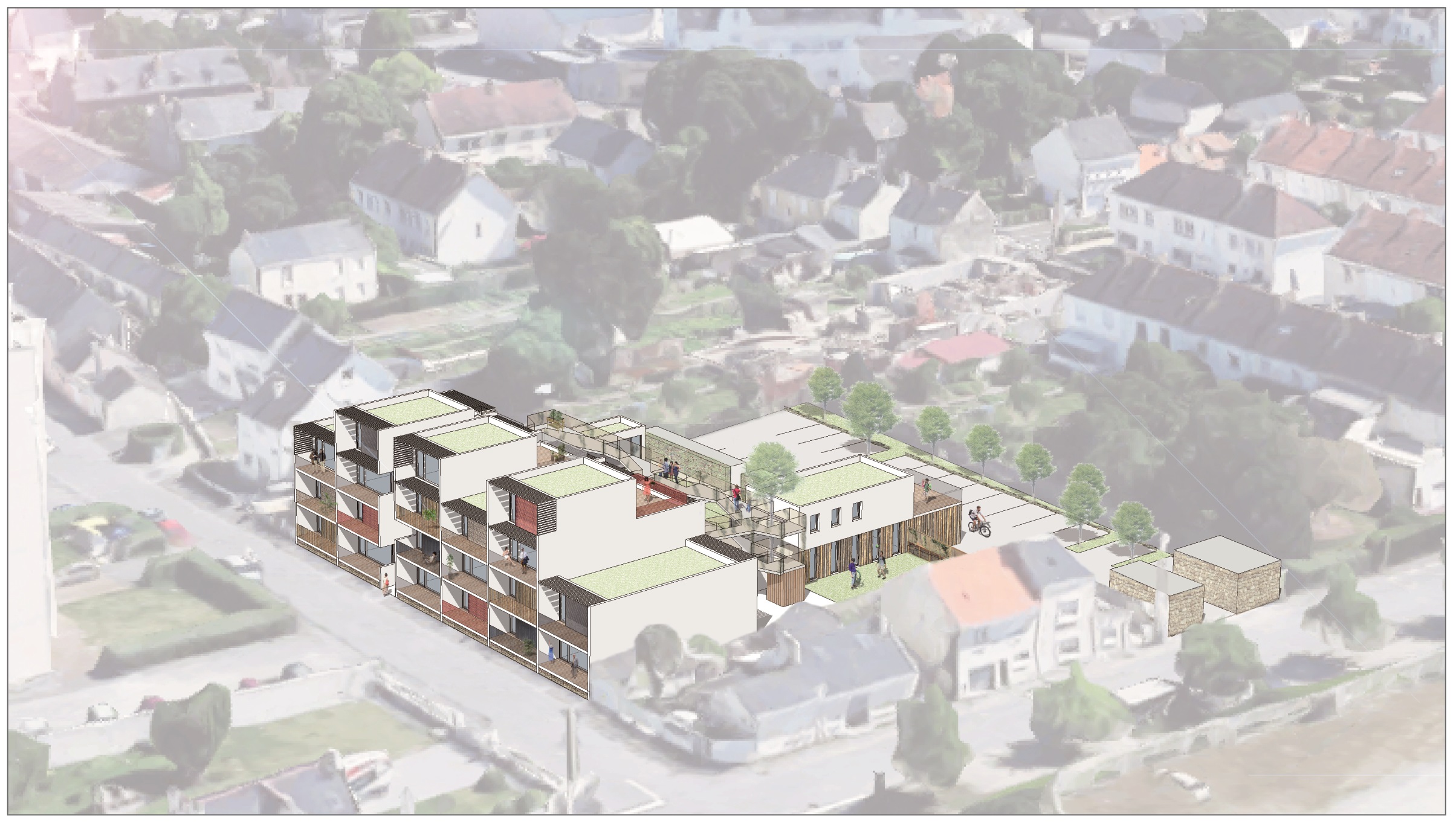 Le Projet de 9 logements vient s'ajouter à un ensemble de 20 logements locatifs sociaux en cours de réhabilitation. L’implantation préserve un maximum d’arbres existants sur la parcelle. Elle est desservie par un prolongement de la voie intérieure qui distribue de nouveaux stationnements. Un chemin piéton longe les fonds de parcelle des logements individuels situés en rive Sud et met en relation le voisinage. Un édicule constitue un appendice visuel lancé vers l'accès aux nouveaux logements. Il concoure à jalonner les déplacements et oriente le regard vers les coursives et escaliers qui desservent la construction. Les niveaux de la construction distribuent 3 logements : un T2, un T3 et un T4. Chacun est traversant et bénéficie d’une orientation principale au SUD. Les logements se prolongent sous forme de loggias qui prennent la fonction de jardin d’hiver et offrent des apports solaires gratuits. L’optimisation des apports naturels se retrouve dans une masse bâtie compacte. Les angles y sont adoucis.
