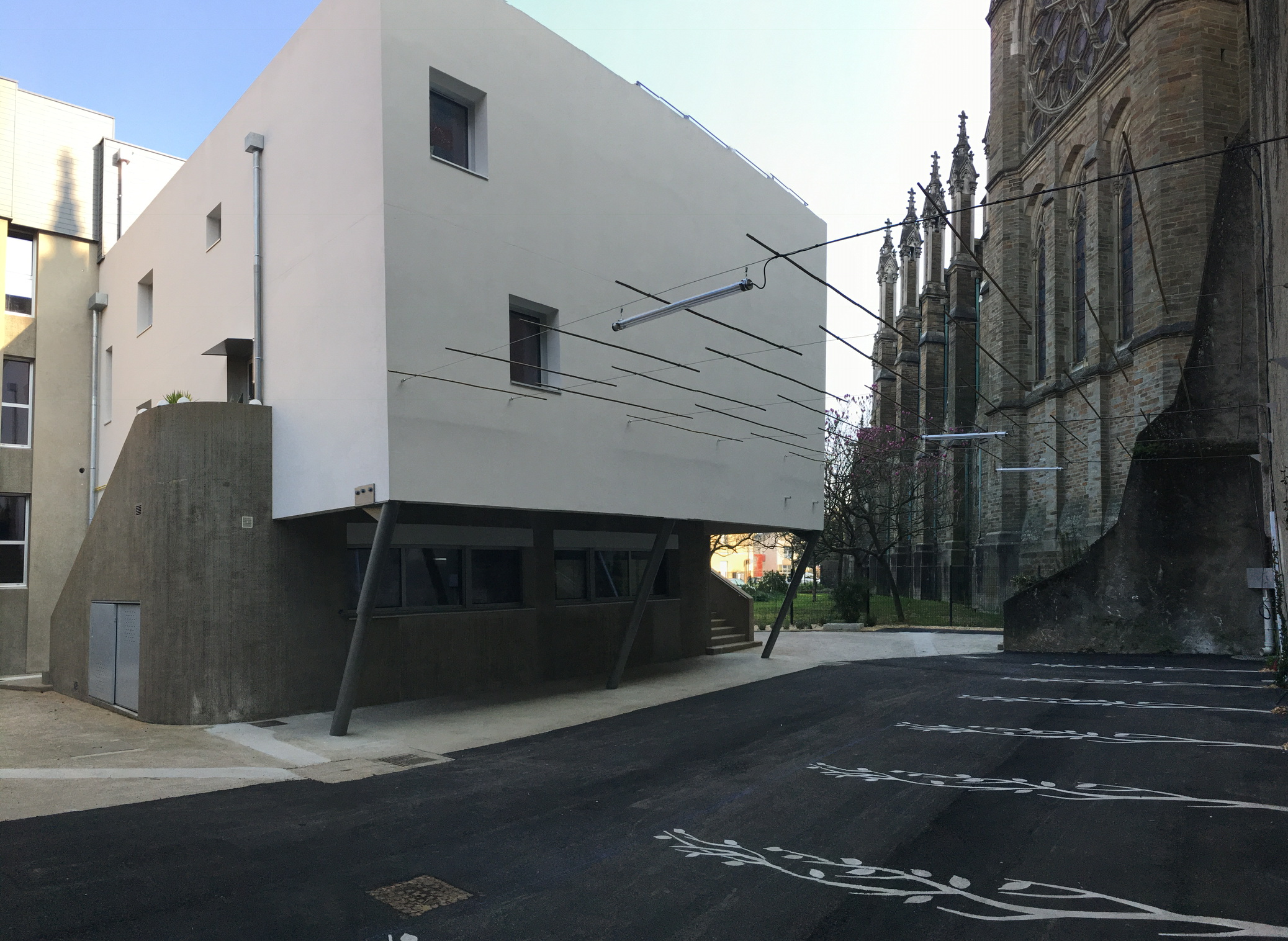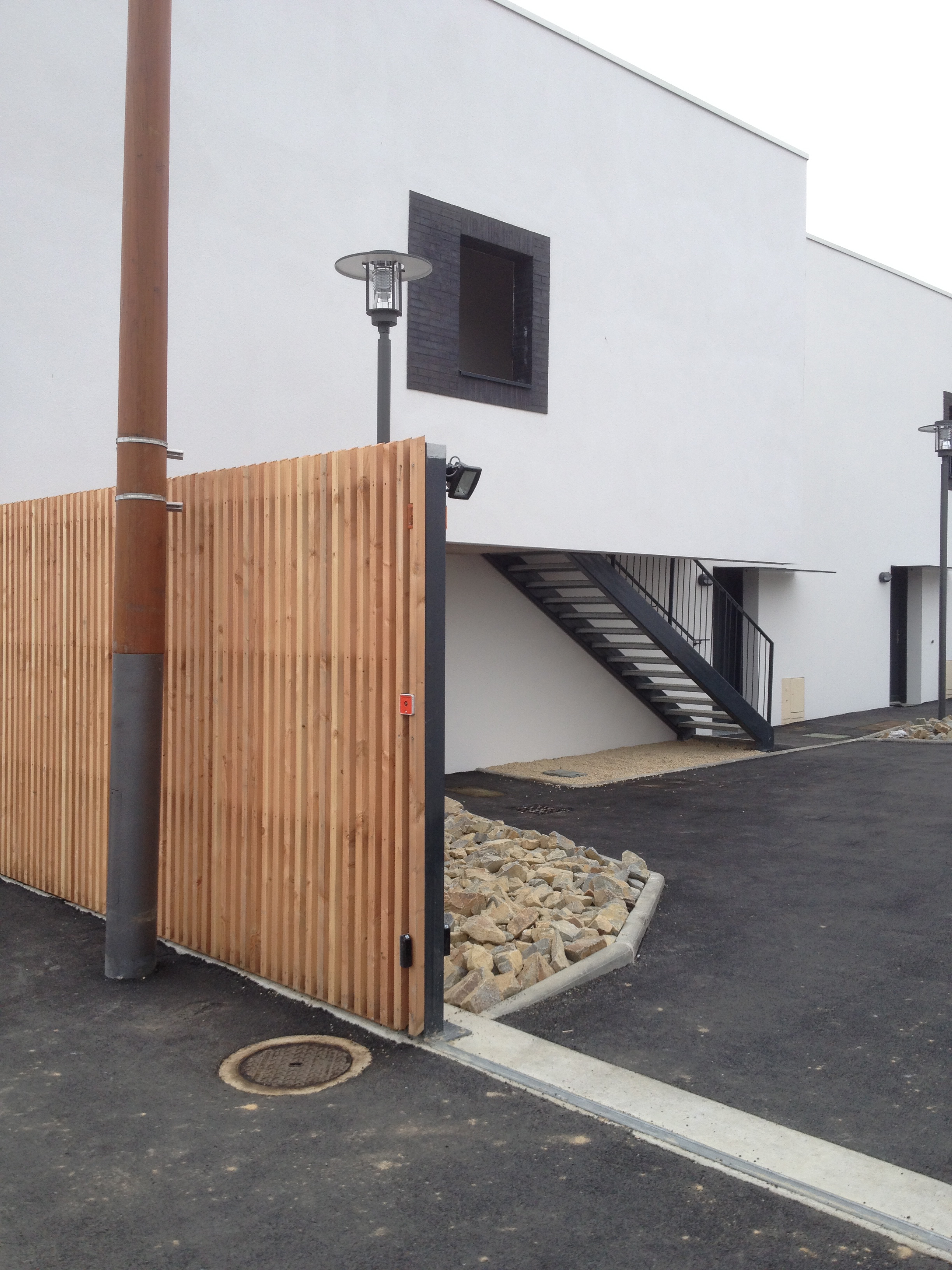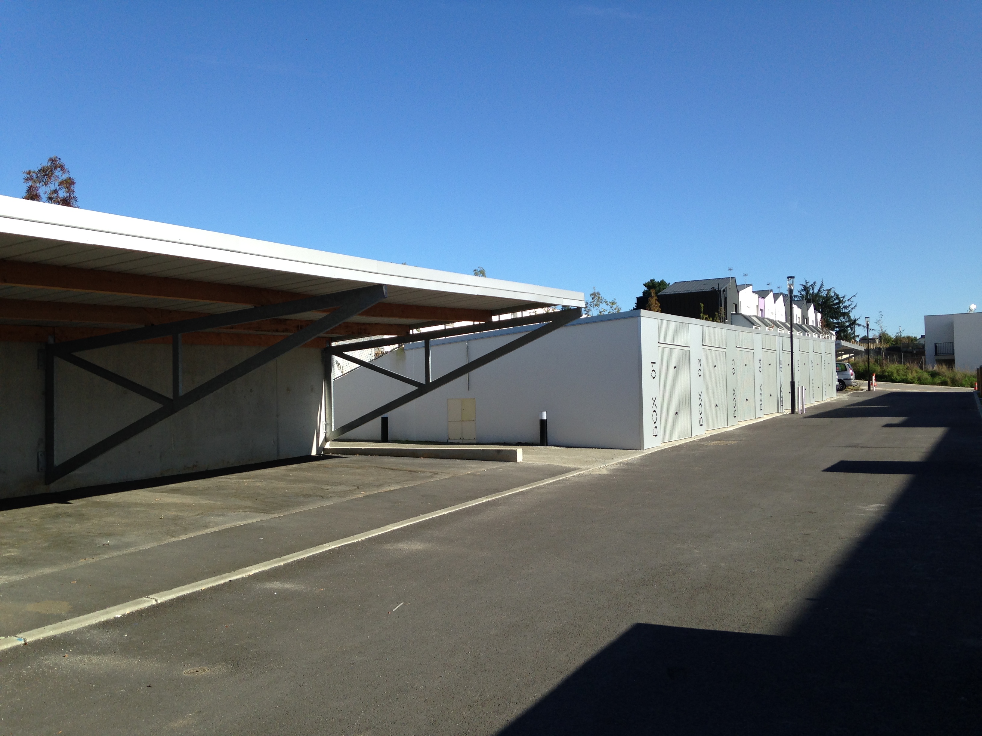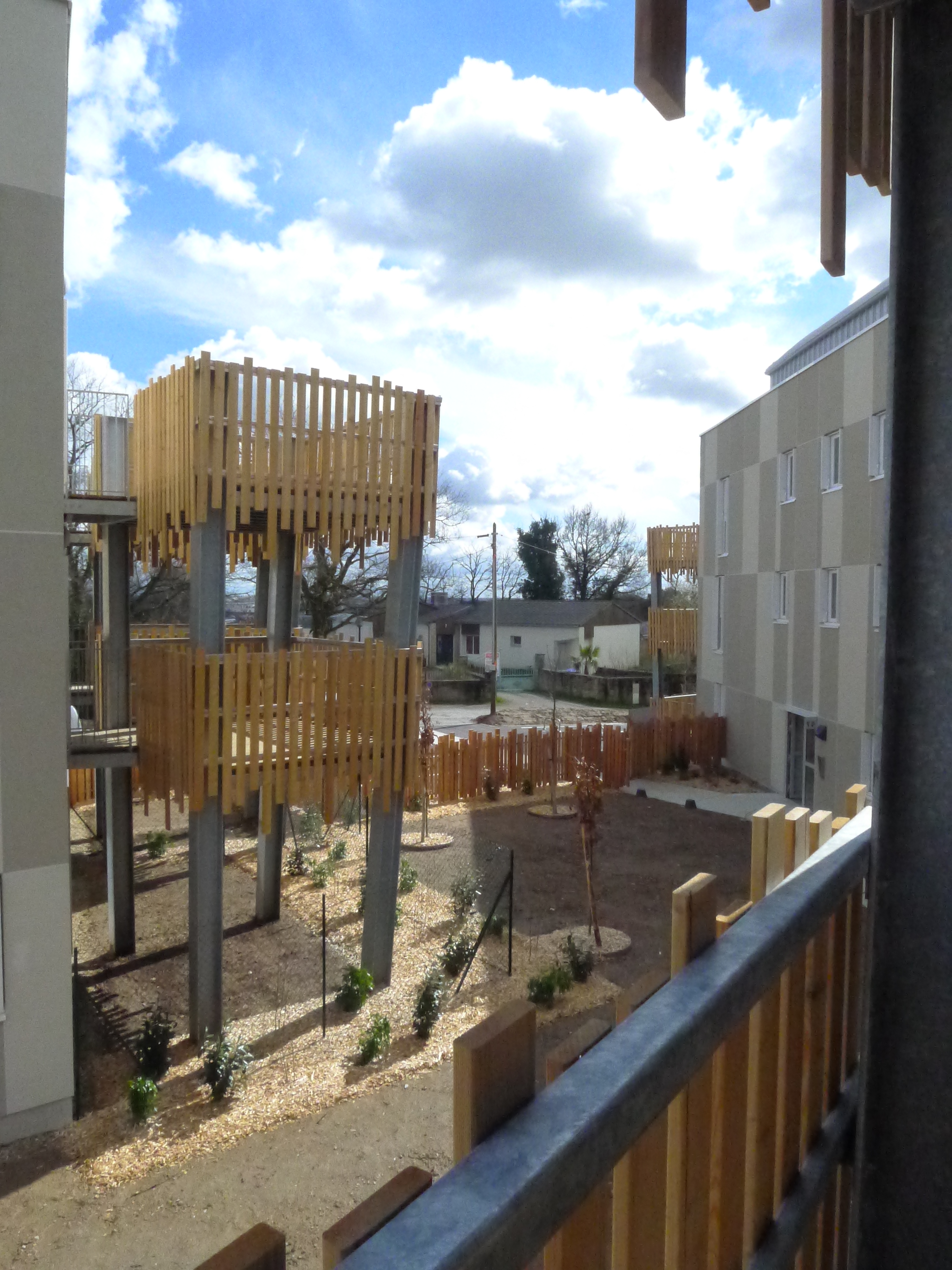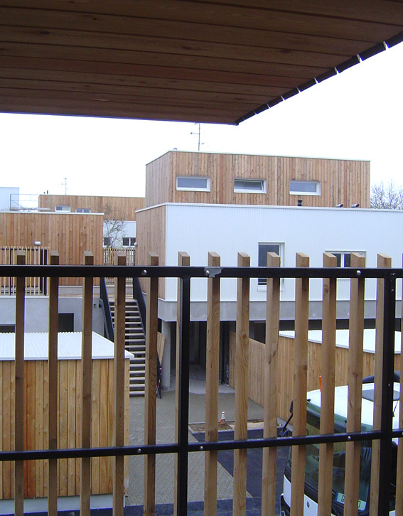 Le Projet de 9 logements vient s'ajouter à un ensemble de 20 logements locatifs sociaux en cours de réhabilitation. L’implantation préserve un maximum d’arbres existants sur la parcelle. Elle est desservie par un prolongement de la voie intérieure qui distribue de nouveaux stationnements. Un chemin piéton longe les fonds de parcelle des logements individuels situés en rive Sud et met en relation le voisinage. Un édicule constitue un appendice visuel lancé vers l'accès aux nouveaux logements. Il concoure à jalonner les déplacements et oriente le regard vers les coursives et escaliers qui desservent la construction. Les niveaux de la construction distribuent 3 logements : un T2, un T3 et un T4. Chacun est traversant et bénéficie d’une orientation principale au SUD. Les logements se prolongent sous forme de loggias qui prennent la fonction de jardin d’hiver et offrent des apports solaires gratuits. L’optimisation des apports naturels se retrouve dans une masse bâtie compacte. Les angles y sont adoucis.
