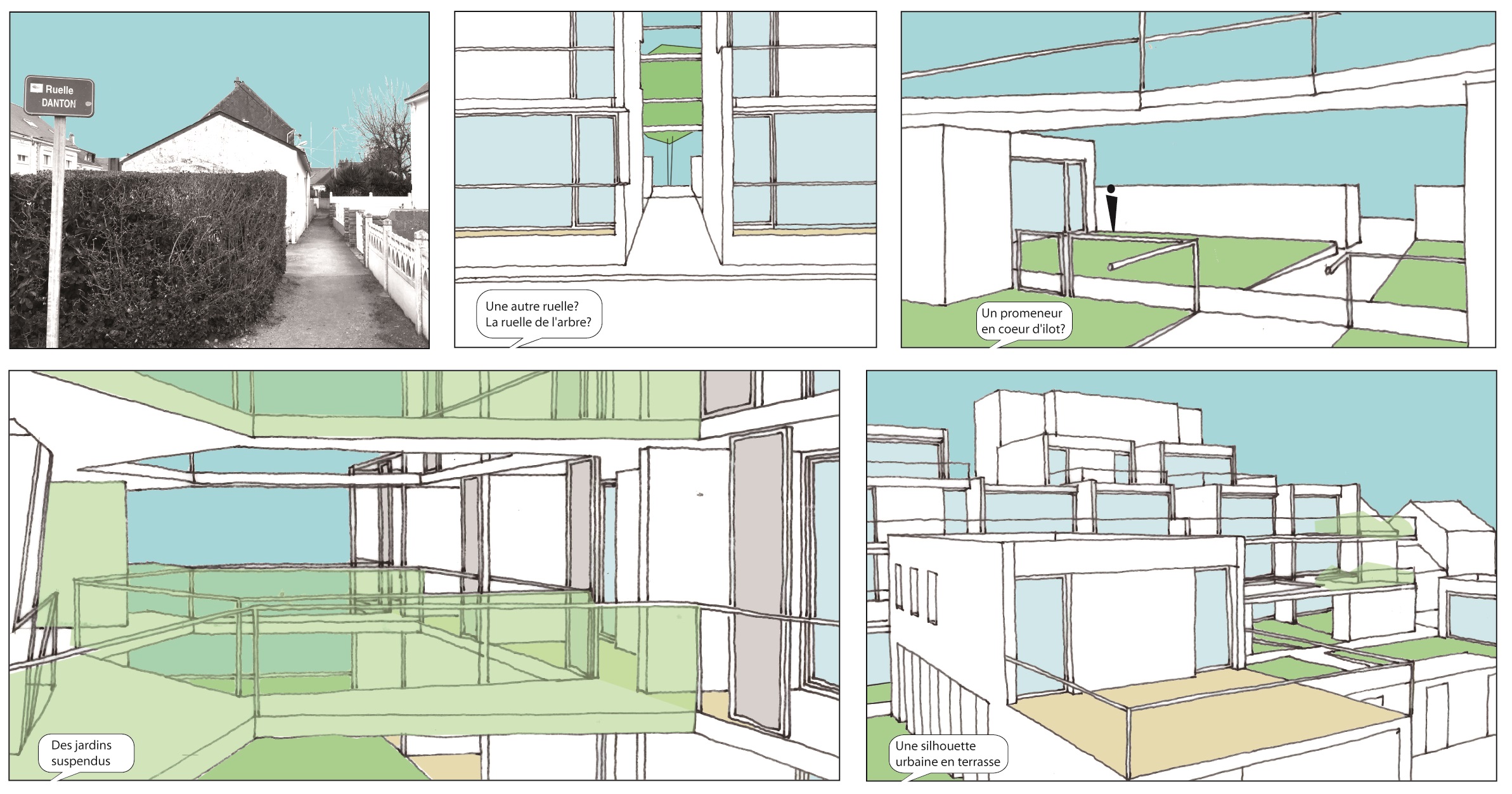 L’enjeu principal du projet est bien la densification et le renouvellement du quartier dans le respect de l’esprit du lieu. Ce quartier est marqué par la présence d’un jardin communautaire disposant d’une vraie dimension collective participant à son identité. Le projet est réparti en 3 voire 5 sous programmes. Il n’oppose pas la forme bâtie aux espaces non bâtis, mais intègre l’ensemble des lieux dans un souci d’unité et de continuité afin de conserver, révéler l’identité spatiale et d’usage de l’ensemble de ce quartier dans une ambiance séduisante où le piéton est au cœur du dispositif : Il jalonne en cinq séquences l’ensemble de ce territoire
