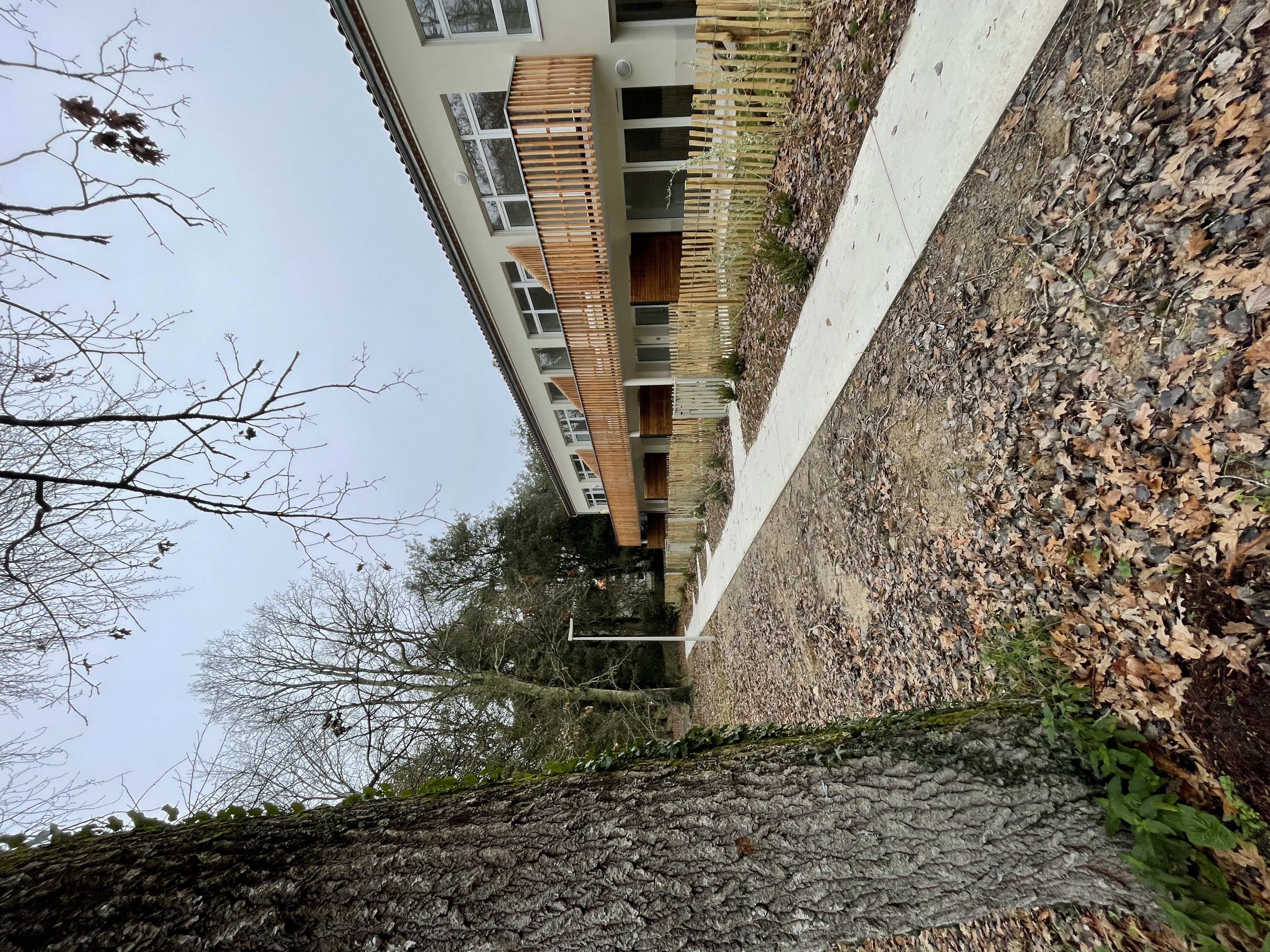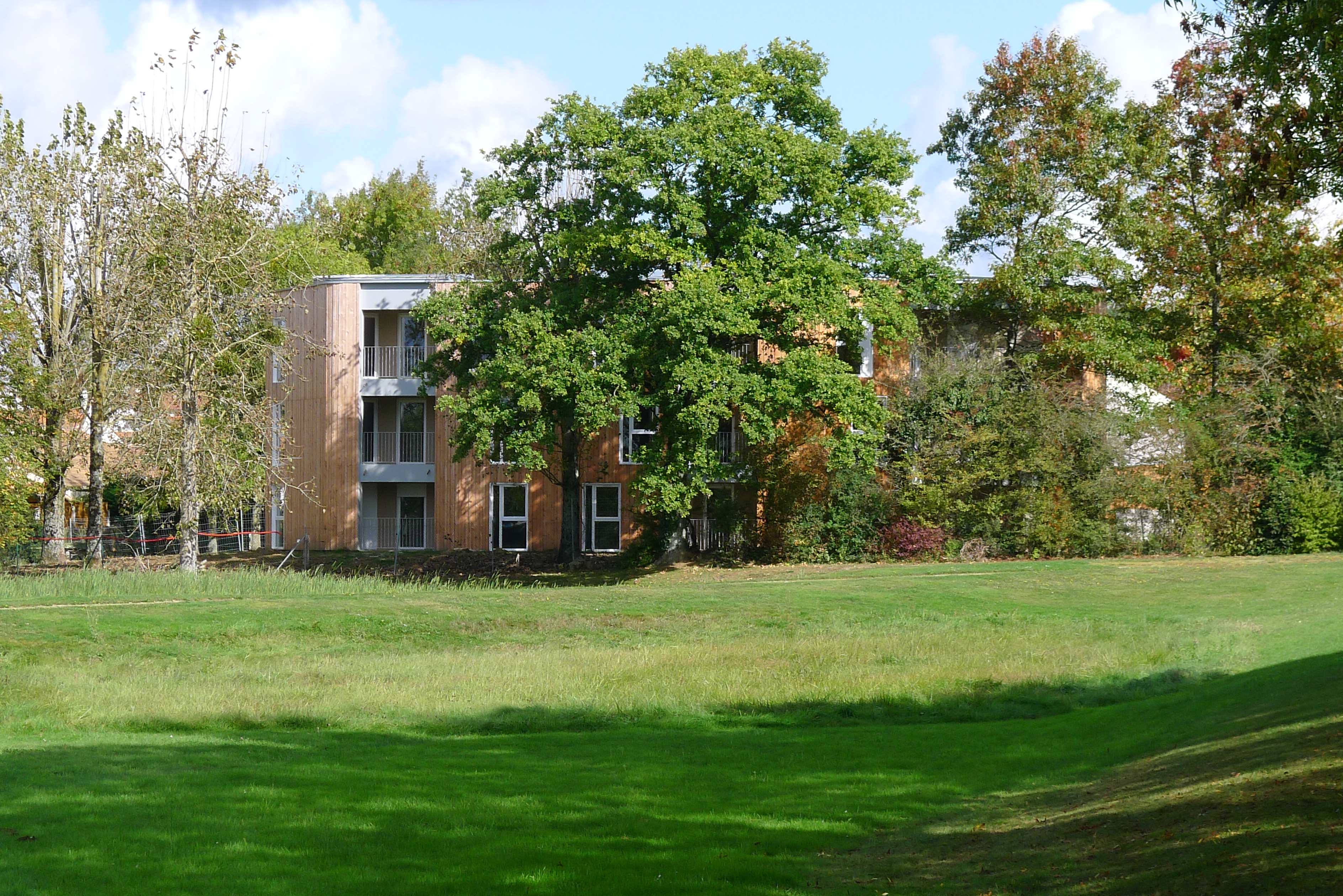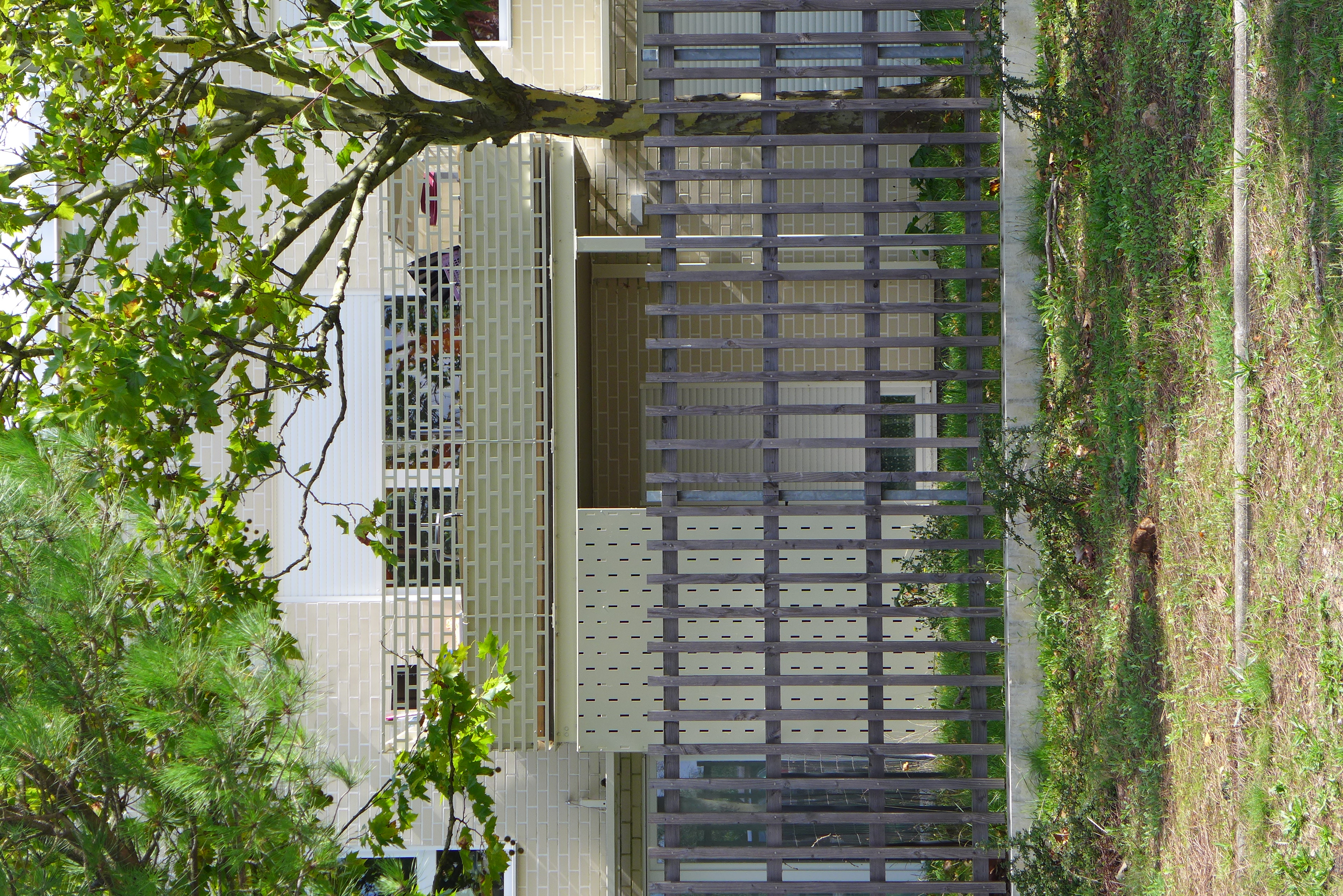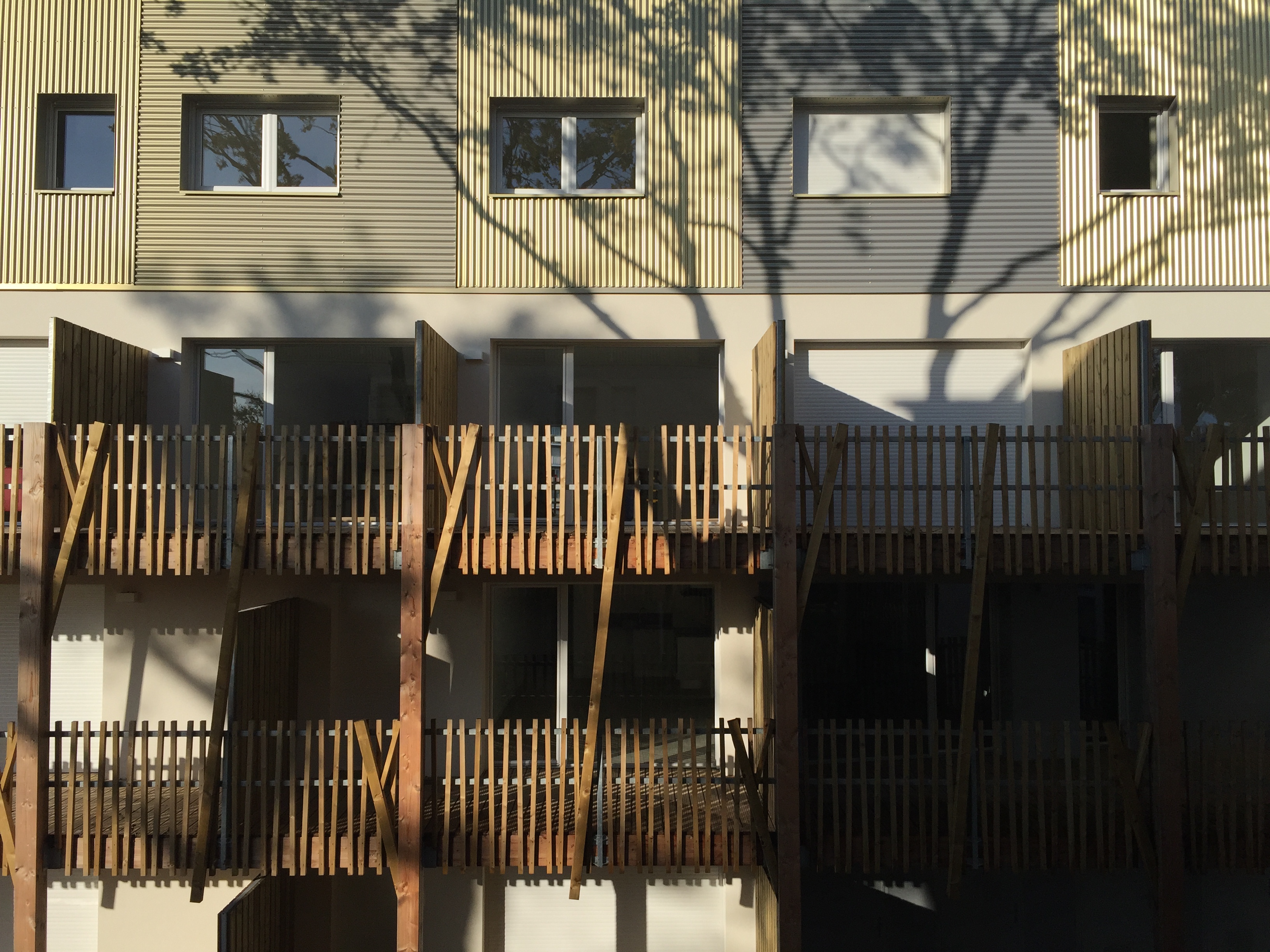 Le projet se décompose en six ensembles de bâtiments en R+3 dont implantation, faite de calages et glissements précis pour préserver le cadre arboré, a pour objectif d’afficher un ensemble immobilier constitué de villas dans un parc. La rigueur constructive à l’œuvre, l’orientation franche au soleil, répondent à un mode d’habiter à la fois ouvert sur l’extérieur ou sur des espaces ensoleillés tout en étant dans des possibilités de repli, d’intériorité forte vers l’intimité du logement. La compacité nous permet de penser une peau épaisse, des façades plus habitées au Nord et au Sud qui regroupent successivement les coursives de desserte, des balcons et terrasses où de grandes baies captent.