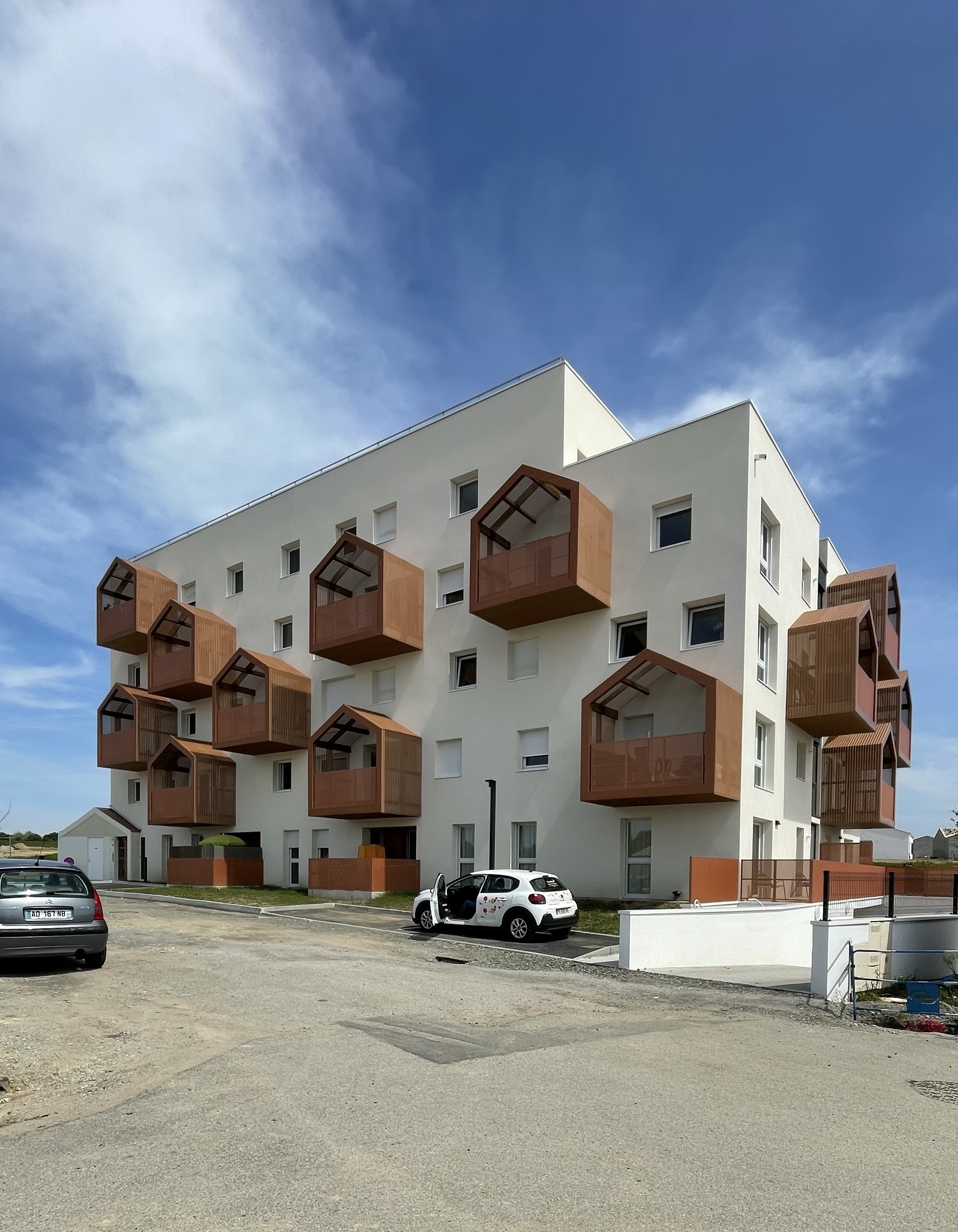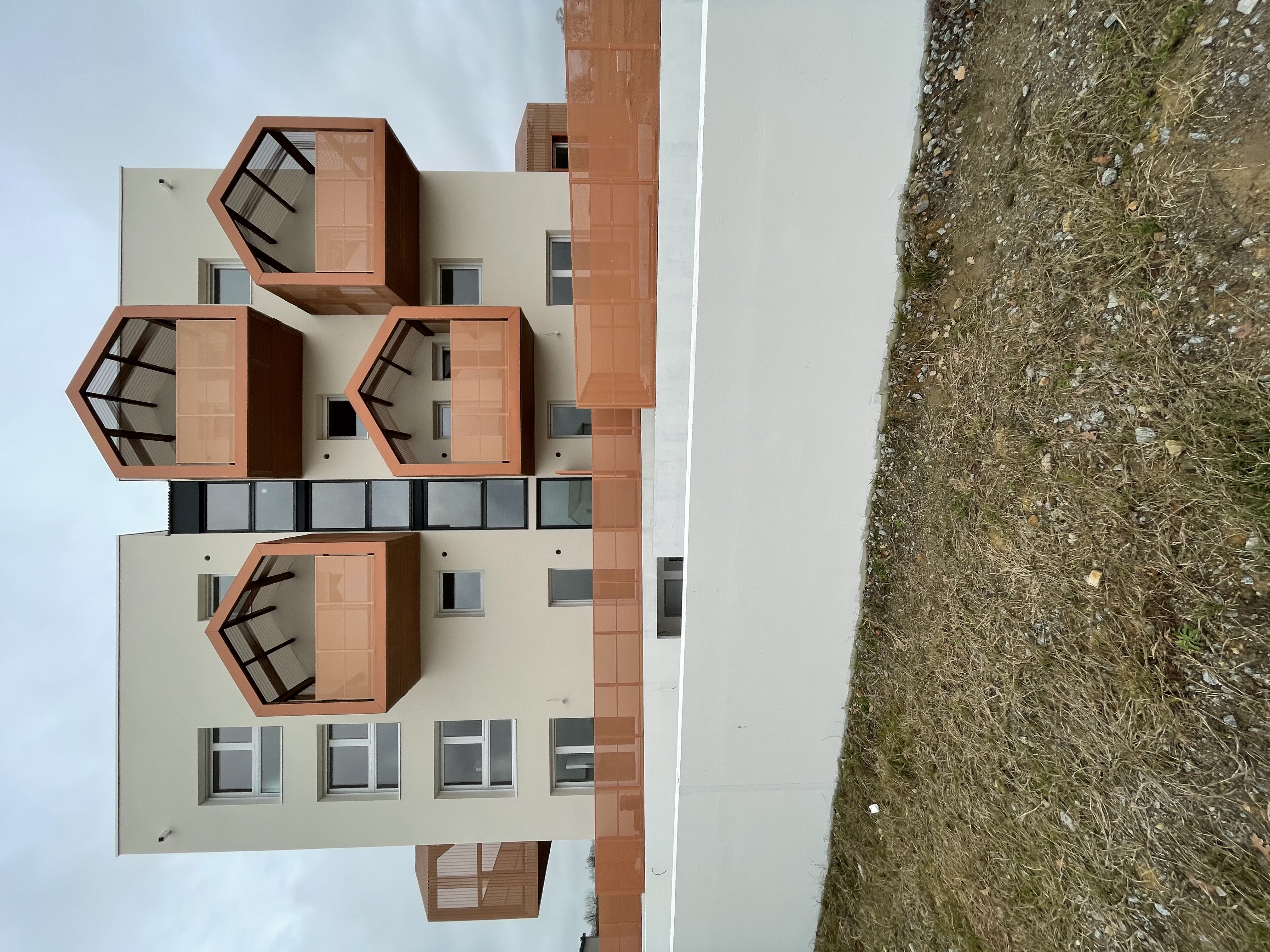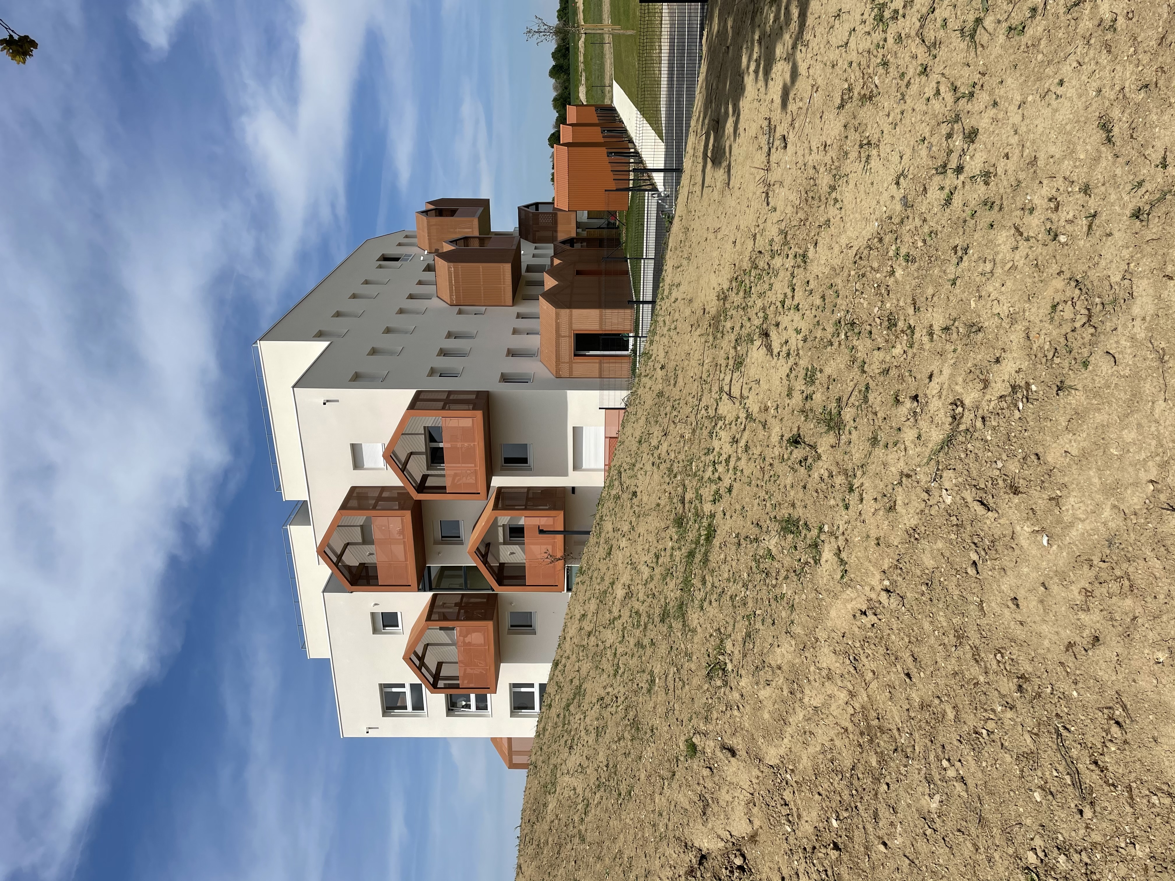 Le projet est situé dans un nouveau quartier constitué avec un habitat pavillonnaire aux volumes et écritures relativement simples. Le projet est édifié en R+4. Pour atténuer sa hauteur relative, des volumes iconiques, repris des profils des pignons, sont déclinés en loggias sur les façades du projet. Ils introduisent une échelle intermédiaire et de la domesticité à cet ensemble collectif. La mémoire du lieu est intégrée par le traitement du dernier étage. Des jardins d’hivers sous forme de serres horticoles font écho à l’histoire de cette terre nouvellement urbanisée.