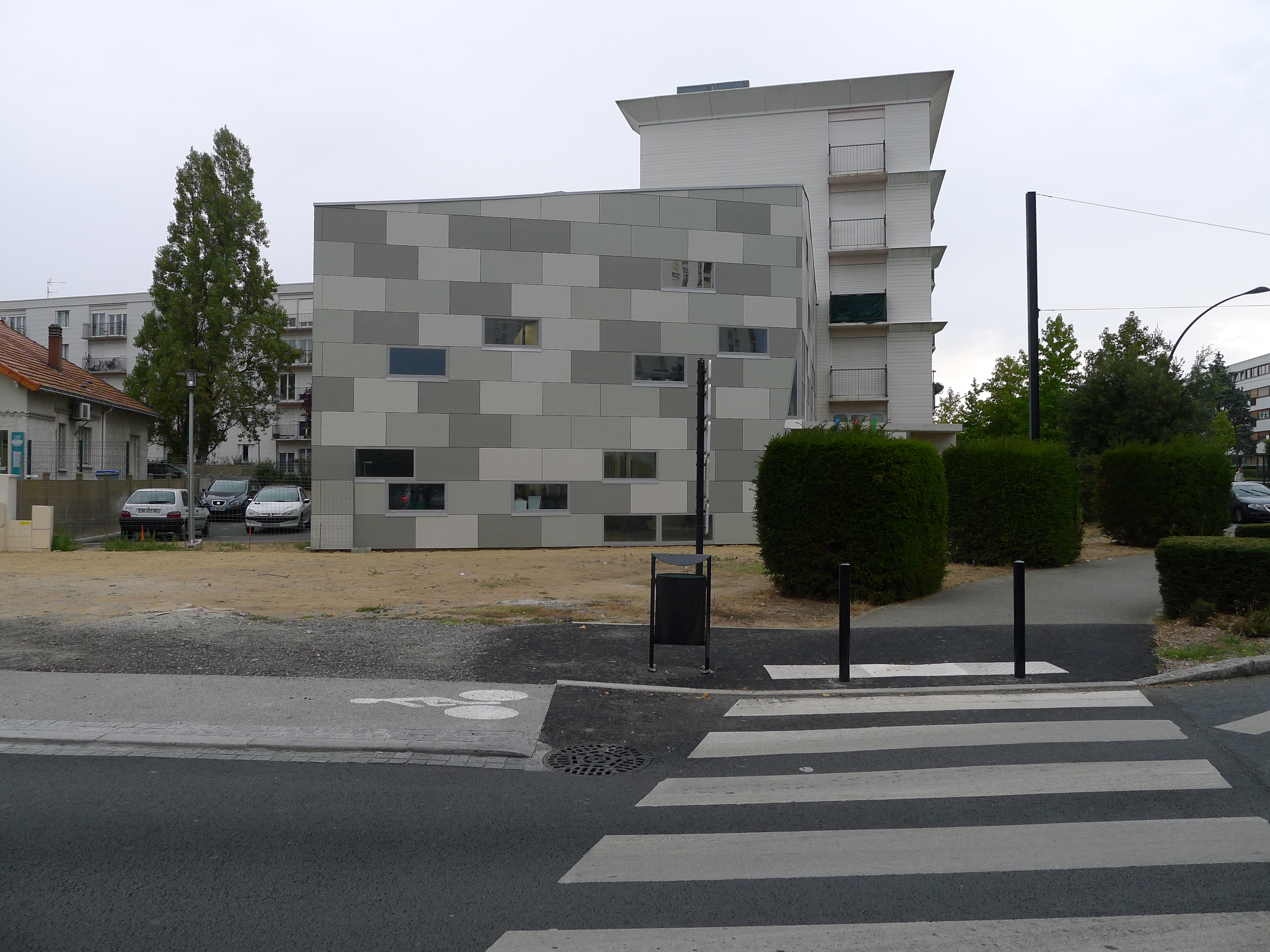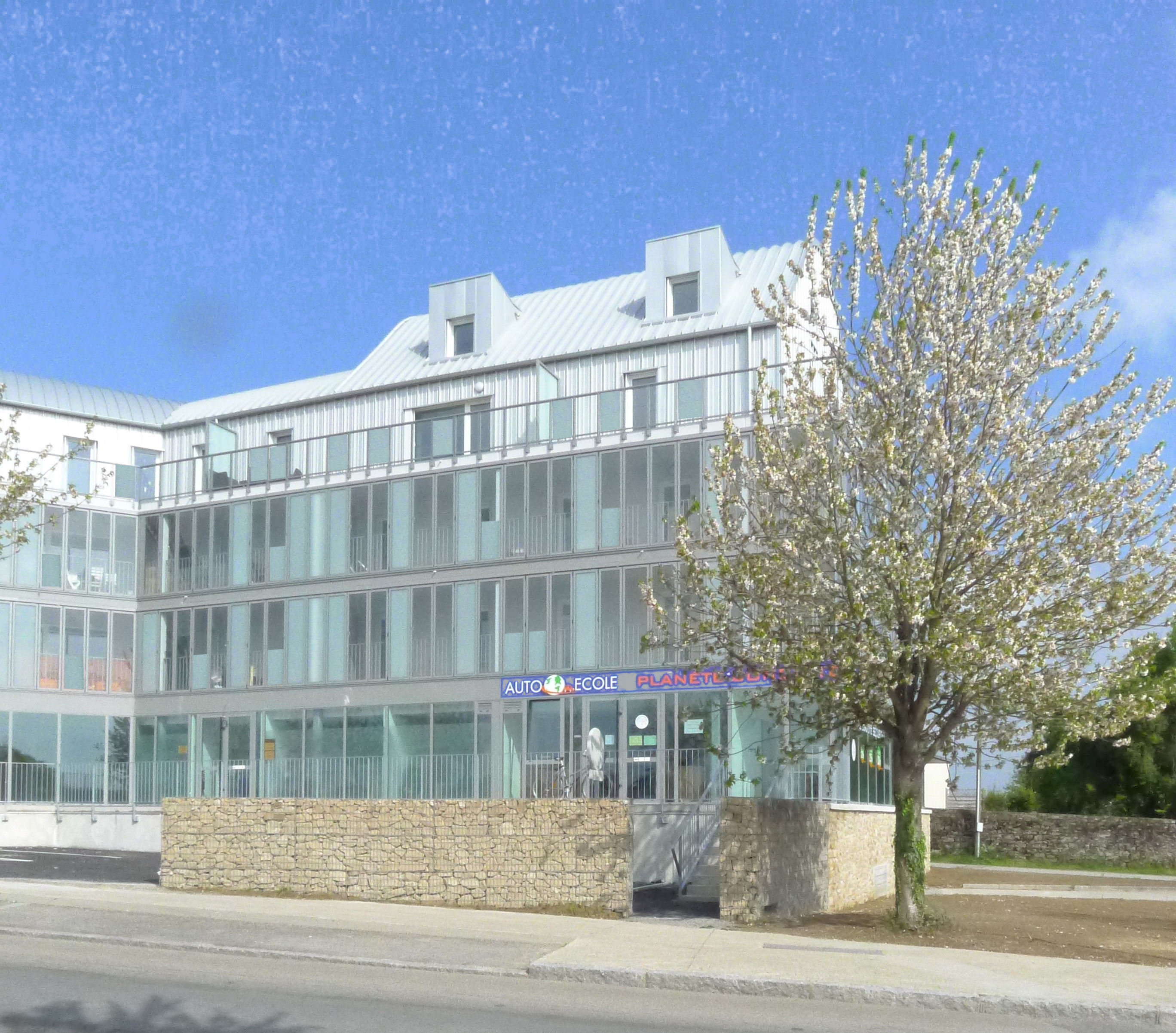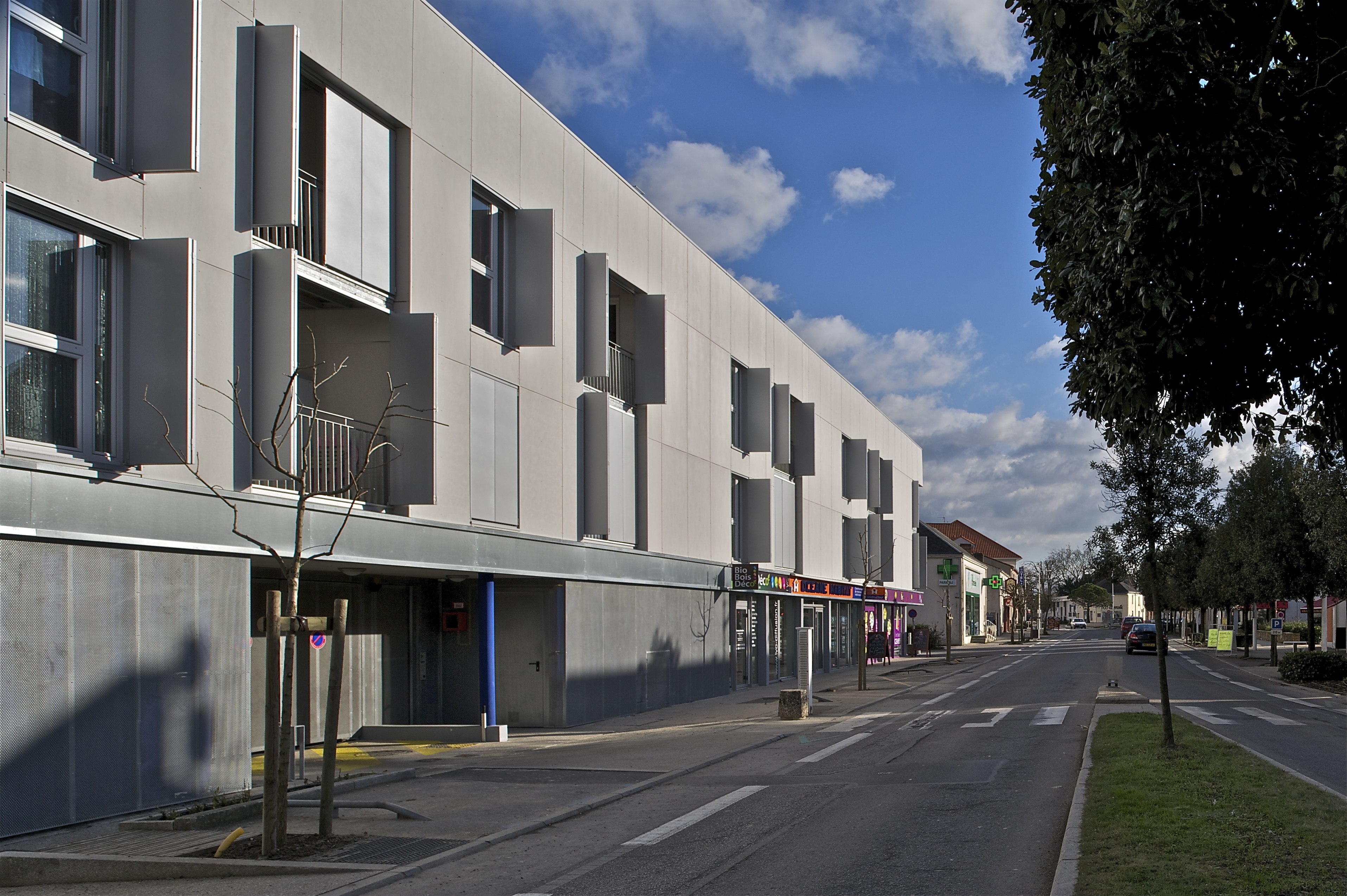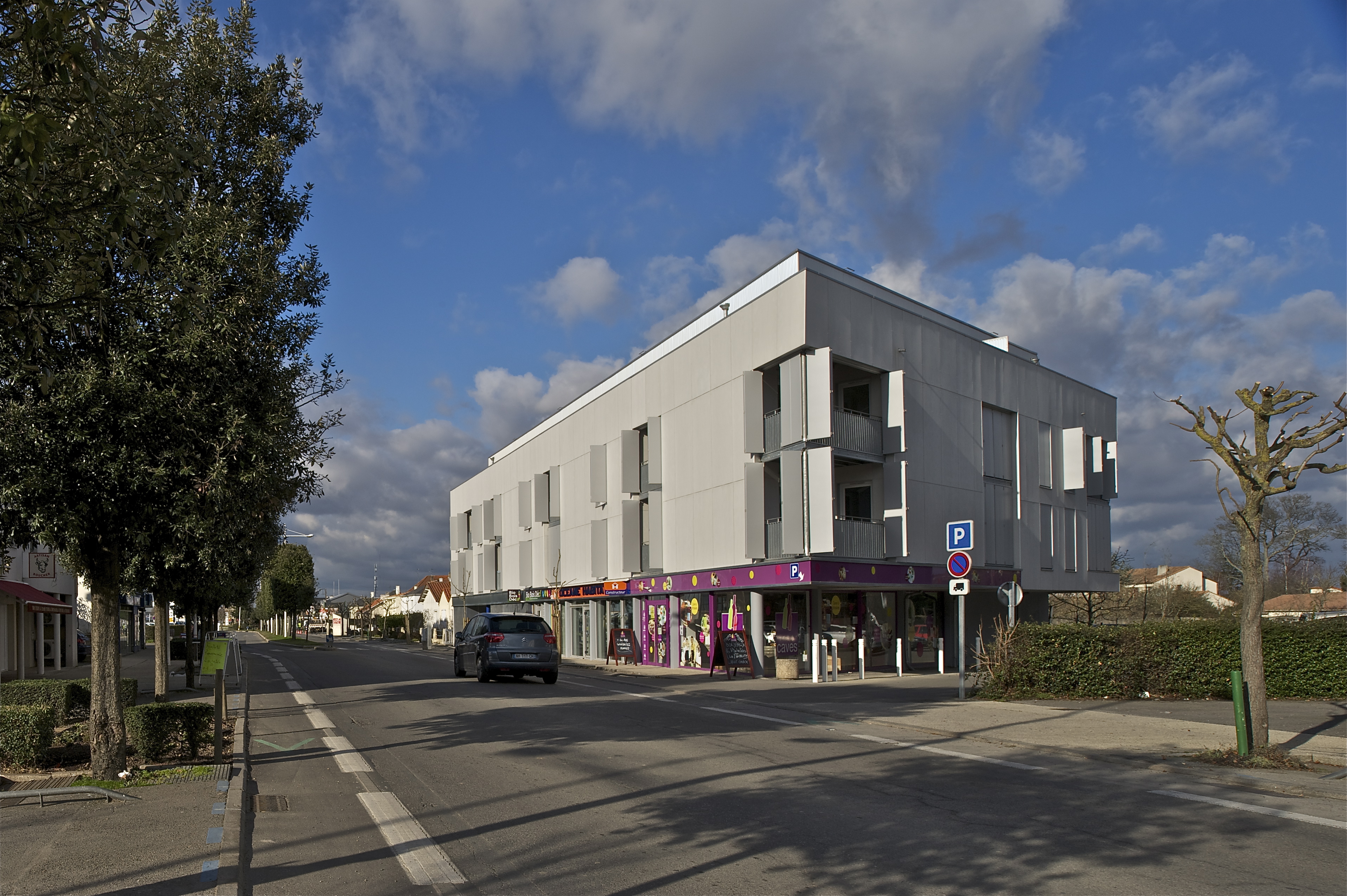 Le projet s'inscrit dans le cadre de la requalification de l'entrée de ville de la Commune. Ce programme mixte de logements et commerces en constitue le premier jalon. Il se situe à l'articulation avec la voie principale d'entrée et une voie en impasse servant actuellement de stationnement. L'approche urbaine du projet vise à clairement hiérarchiser les voies qui le bordent. Un porte à faux important abritant les accès aux commerces permet de resserrer l'accès à la voie en impasse. Cet appendice tactile, ce glissement, opère un rapprochement avec la construction existante à l'opposé et inscrit le projet dans une continuité urbaine. L'environnement bruyant a dicté l'organisation intérieure des logements en développant une loggia qui permet d'enrichir les déplacements et les vues à l'intérieur des logements.