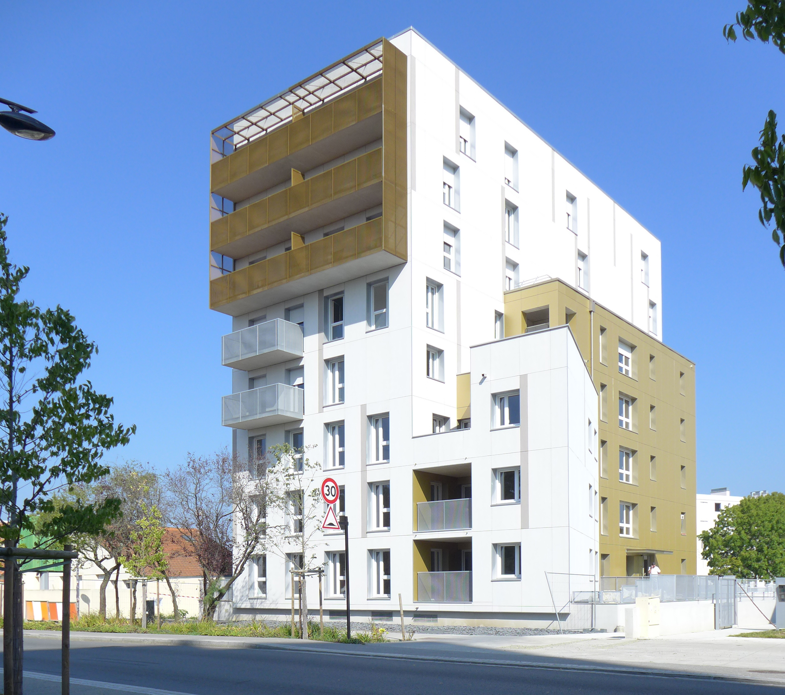 L'opération porte sur la réalisation de 46 logements collectifs et de commerces dans la ZAC Grenapin, au cœur d'un quartier de grands ensembles en renouvellement urbain. Bordé d'espaces publics, le projet se veut autonome. Il prend la forme d'un immeuble d'angle reposant sur un socle, qui épouse la pente naturelle du terrain et accueille commerces et parkings. Un bandeau en tôle perforée marque l'horizontalité du socle, et sépare le public du privé. Les logements sont situés au dessus et en retrait du socle, dans un volume dont l'angle arrondi marque l'articulation entre les 2 espaces publics que sont la place et le boulevard. On privilégie ainsi des façades orientées sud-est et sud ouest, percées par les grandes baies des séjours, chacune associée à un balcon. Le positionnement des baies en quinconce crée un rythme continu, qui souligne le rapport entre les espaces publics. La cour située à l'arrière du bâtiment accueille un espace planté de chênes, érables et pins.