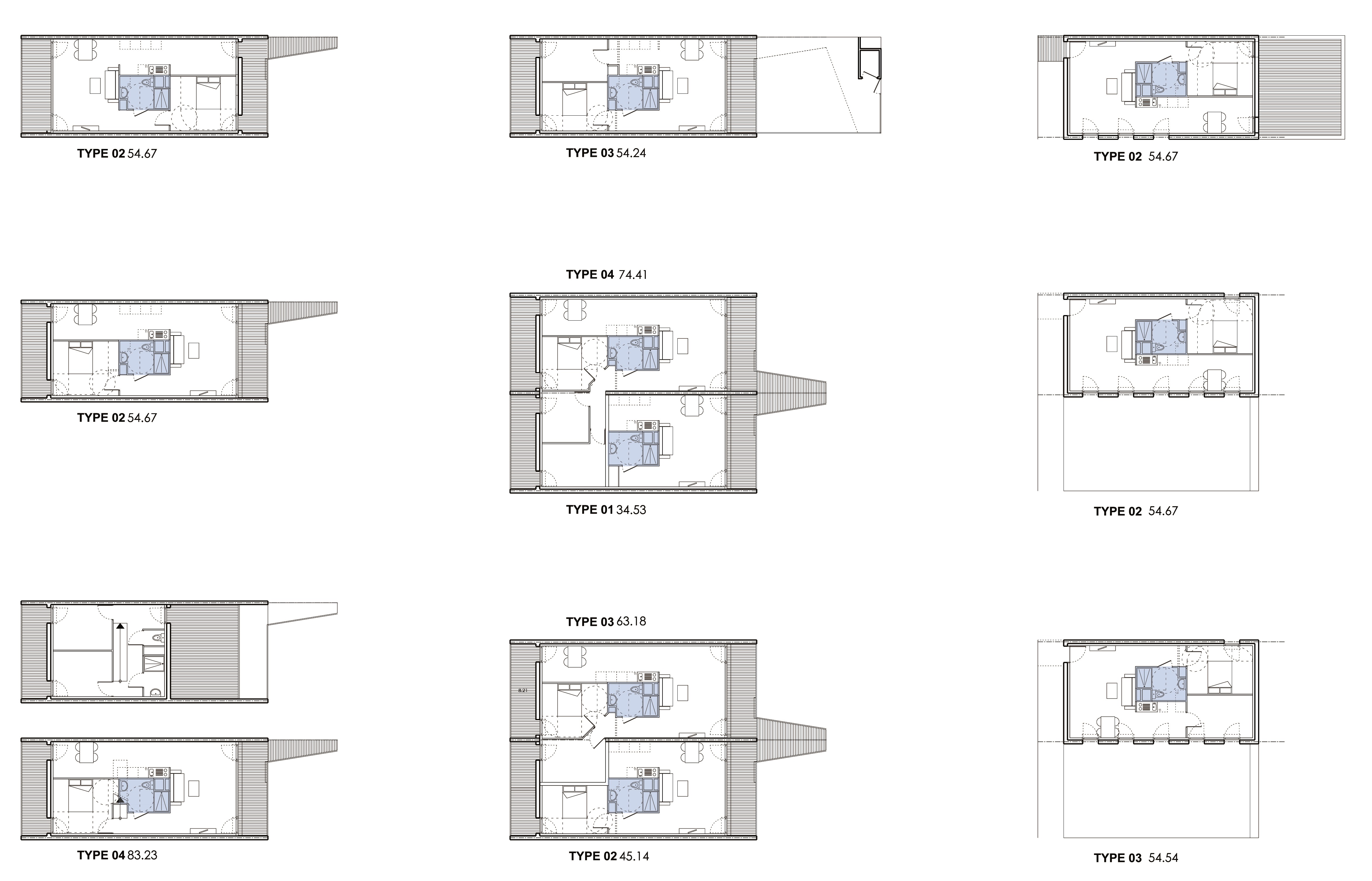 L’Unité d’Habitation constitue le squelette du projet. Elle se caractérise par un plan neutre d’environ 54 m² qui comprend :