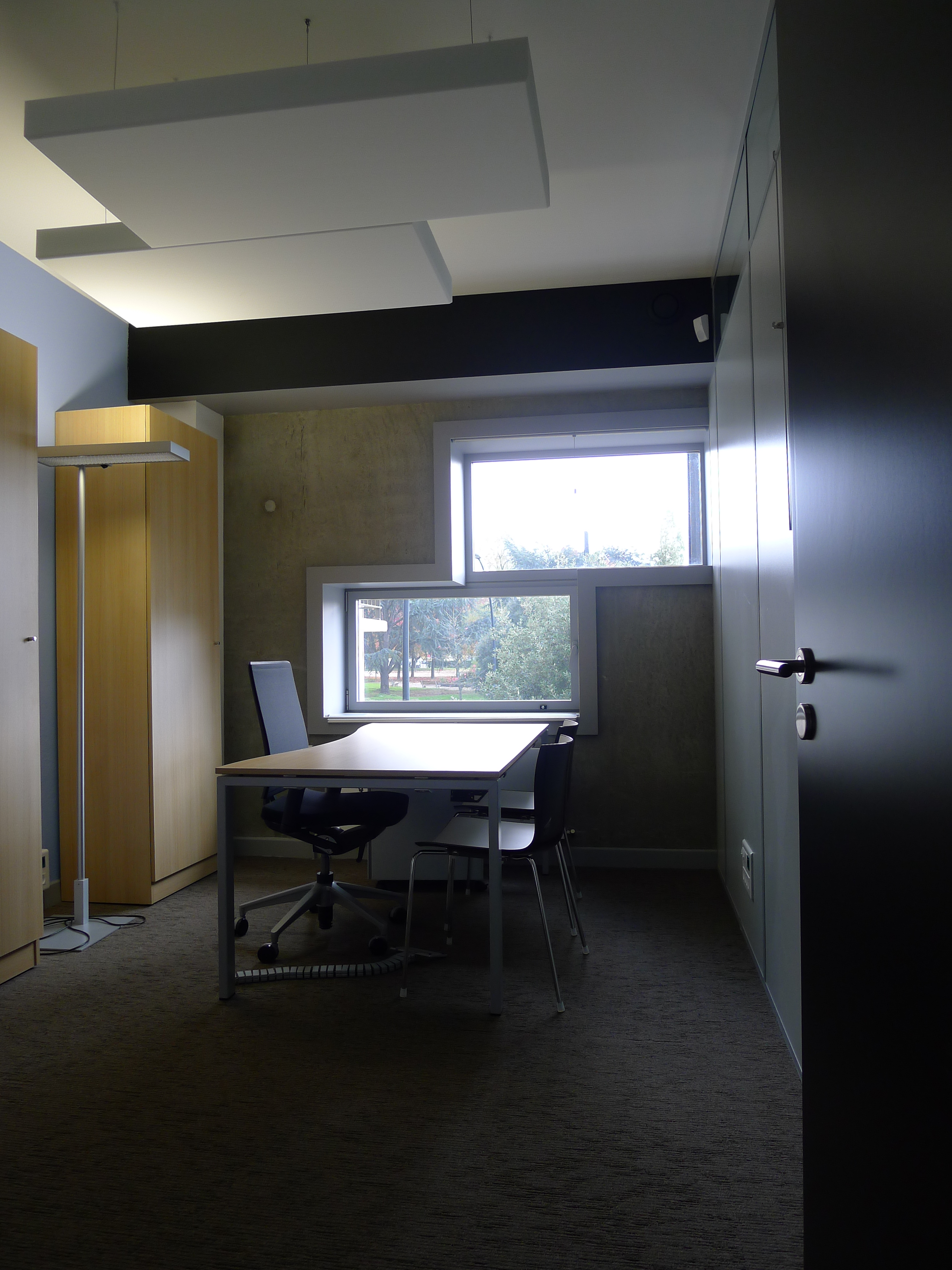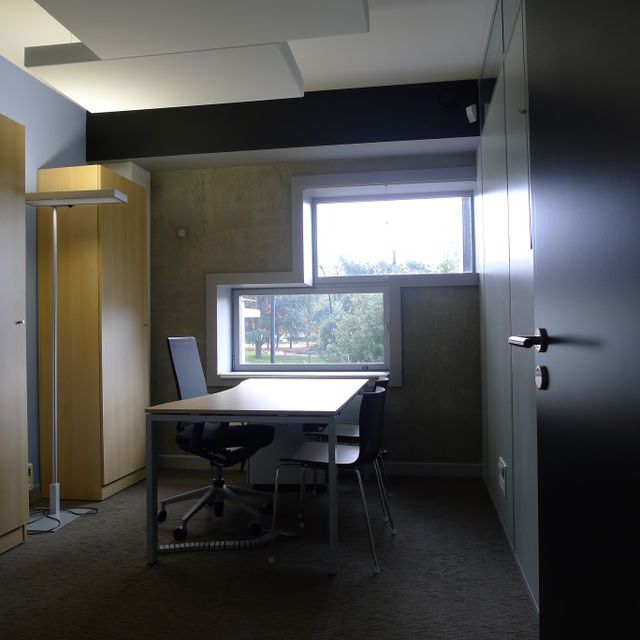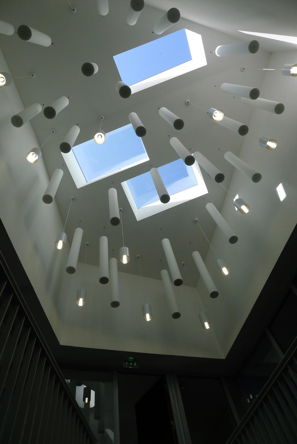 Le projet est lové contre un immeuble de logements existants. Sa volumétrie très compacte est traitée comme un objet sculpté. L’ensemble des façades s’affranchit du vocabulaire résidentiel. Elles sont traitées de manière unitaire au même titre que la toiture, la 5ème façade. Elles sont habillées avec un parement extérieur, des vitrages et de panneaux photovoltaïques. Ils forment une composition tripartite dont les teintes jouent dans la même gamme, telle une pixellisation. Ce dessin, évitant l’évidence de la fonction, créé une rupture d’échelle permettant au projet d’acquérir le statut d’objet qui concoure à la focalisation du regard, voire d’afficher une présence presque tactile. Une entaille dans l’angle signale l’accès principal. Cet immeuble de bureaux a une surface contenue avec douze bureaux. Ils sont organisés autour d’un atrium central, lieu où tous les déplacements et vues convergent.