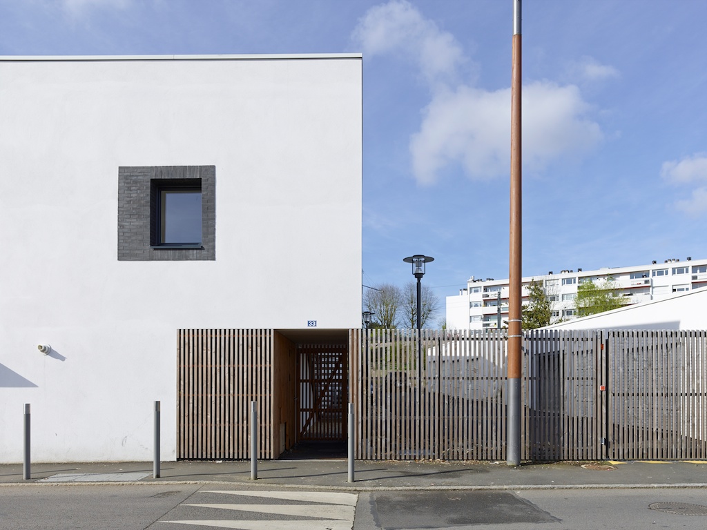 Il referme la résidence et préserve la quiétude du cœur d’ilot. L’ensemble est organisé sous forme de logements intermédiaires sur 2 niveaux, dans un volume compact. 4 logements sont situés au RDC et 4 autres à l’étage. Il y a 6 T3 et 2 T4. Les logements sont desservis par une coursive au Nord qui se lie aux accès existants des collectifs. Ce dispositif amplifie les déplacements et permet de créer un lieu de rencontre possible entre les habitants. Les logements s’ouvrent à la course du soleil sur leurs parties extérieures privatives. Elles sont préservées depuis la rue par 2 traitements successifs. L’un végétal, espace commun, qui affiche l’image de la résidence et l’autre privatif, délimité par une clôture bois qualifiante. Les façades du bâtiment sont entièrement revêtues d’un parement en brique. Ce matériau fait écho à la matière de Clisson sans être littéral. Le motif des briques est repris sur les gardes corps des balcons et coursive.
